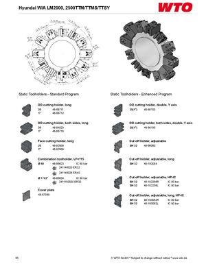 Hyundai WIA LM2000, 2500TTM/TTMS/TTSY Static Toolholders - Standard Program Static Toolholders - Enhanced Program OD cutting holder, long OD cutting holder, double, Y axis 25 48-86711 25(1") 48-86103 1" 48-86712 OD cutting holder, both sides, long OD cutting holder, both sides, double, Y axis 25 48-84523 25(1") 48-86150 1" 48-86718 Face cutting holder, long Cut-off holder, adjustable 25 48-92958 SH 32 48-99060 1" 48-92959 Combination toolholder, LF=115 Cut-off holder, adjustable, long Ø 40 48-86623 IC 80 bar SH 32 48-100084 241140020 ER32 241140026 ER40 Ø 1 1/2" 48-86624 IC 80 bar Cut-off holder, adjustable, HP-IC 2411150020 ER32 SH 32 48-102256R IC 80 bar SH 32 48-102256L IC 80 bar Cover plate 48-87089 Cut-off holder, adjustable, long, HP-IC SH 32 48-100082R IC 80 bar SH 32 48-100082L IC 80 bar 30 © WTO GmbH * Subject to change without notice * www.wto.de