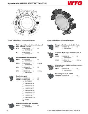 Hyundai WIA LM2000, 2500TTM/TTMS/TTSY Driven Toolholders - Enhanced Program Driven Toolholders - Enhanced Program Right angle milling unit with combination mill Straight drill/milling unit, double, Y axis arbor DIN 6358, LF=100 ER 25 413002004-65 1:1 EC Ø 22 410622002-65 1:1 EC 00675000907 00675000483 Ø 1" 410625002-65 1:1 EC 2-spindle - Right angle drill/milling unit, Y 00675000483 axis ER 25 413502006-65 1:1 EC Adjustable angle drill/milling unit 00675000915 ER 16 411010002-65 1:1 EC ER 25 413502007-65 1:1 IC 80 bar 00675000902 00675000915 ER 16 411010003-65 1:1 IC 80 bar 00675000902 2-spindle - Right angle drill/milling unit, both ER 11 411007002-65 1:2 EC sides, Y axis 00675000914 ER 25 413502008-65 1:1 EC ER 11 411007003-65 1:2 IC 80 bar 00675000915 00675000914 Broaching unit for ID and OD Gear hobbing unit TN765050 414532000-65 1:1 EC Type 16-1 411500003-65 1:1 EC Type 16-1 411500002-65 2:1 EC 00675000927 160016161 Ø 16 160022161 Ø 22 160027161 Ø 27 160015161 Ø 5/8" 160019161 Ø 3/4" 160025161 Ø 1" 160031161 Ø 1 1/4" 110587 Straight drill/milling unit, both sides ER 25 413002001-65 1:1 EC 00675000907 32 © WTO GmbH * Subject to change without notice * www.wto.de