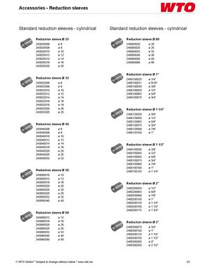 Accessories - Reduction sleeves Standard reduction sleeves - cylindrical Standard reduction sleeves - cylindrical Reduction sleeve Ø 25 Reduction sleeve Ø 80 240025006 ø6 240080020 ø 20 240025008 ø8 240080025 ø 25 240025010 ø 10 240080032 ø 32 240025012 ø 12 240080040 ø 40 240025014 ø 14 240080050 ø 50 240025016 ø 16 240080060 ø 60 240025020 ø 20 Reduction sleeve Ø 1" Reduction sleeve Ø 32 2400100025 ø 1/4" 240032006 ø6 2400100031 ø 5/16" 240032008 ø8 2400100038 ø 3/8" 240032010 ø 10 2400100050 ø 1/2" 240032012 ø 12 2400100063 ø 5/8" 240032014 ø 14 2400100075 ø 3/4" 240032016 ø 16 240032018 ø 18 240032020 ø 20 Reduction sleeve Ø 1 1/4" 240032025 ø 25 2400125038 ø 3/8" 2400125050 ø 1/2" 2400125063 ø 5/8" Reduction sleeve Ø 40 2400125075 ø 3/4" 240040006 ø6 2400125088 ø 7/8" 240040008 ø8 2400125100 ø 1" 240040010 ø 10 240040012 ø 12 240040014 ø 14 Reduction sleeve Ø 1 1/2" 240040016 ø 16 240040020 ø 20 2400150038 ø 3/8" 240040025 ø 25 2400150050 ø 1/2" 240040032 ø 32 2400150063 ø 5/8" 2400150075 ø 3/4" 2400150088 ø 7/8" 2400150100 ø 1" Reduction sleeve Ø 50 2400150125 ø 1 1/4" 240050010 ø 10 240050012 ø 12 240050016 ø 16 Reduction sleeve Ø 2" 240050020 ø 20 240050025 ø 25 2400200050 ø 1/2" 240050025 ø 25 2400200063 ø 5/8" 240050032 ø 32 2400200088 ø 7/8" 240050040 ø 40 2400200100 ø 1" 2400200125 ø 1 1/4" 2400200150 ø 1 1/2" 2400200175 ø 1 3/4" Reduction sleeve Ø 60 240060012 ø 12 240060016 ø 16 Reduction sleeve Ø 3" 240060020 ø 20 240060025 ø 25 2400300075 ø 3/4" 240060032 ø 32 2400300100 ø 1" 240060040 ø 40 2400300125 ø 1 1/4" 240060050 ø 50 2400300150 ø 1 1/2" 2400300200 ø 2" 2400300250 ø 2 1/2" © WTO GmbH * Subject to change without notice * www.wto.de 33
