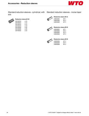 Accessories - Reduction sleeves Standard reduction sleeves - cylindrical, with Standard reduction sleeves - morse taper slot Reduction sleeve Ø 32 Reduction sleeve Ø 40 240532001 MT 1 240140010 ø 10 240532002 MT 2 240140012 ø 12 240532003 MT 3 240140015 ø 15 240140016 ø 16 240140020 ø 20 Reduction sleeve Ø 40 240140025 ø 25 240540001 MT 1 240140032 ø 32 240540002 MT 2 240540003 MT 3 240540004 MT 4 Reduction sleeve Ø 50 240550002 MT 2 240550003 MT 3 240550004 MT 4 34 © WTO GmbH * Subject to change without notice * www.wto.de