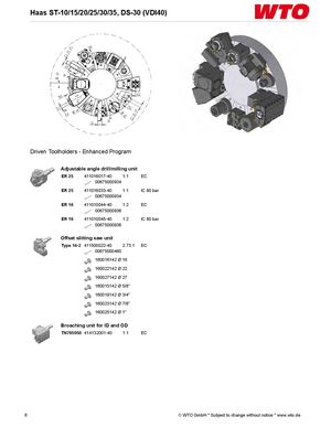 Haas ST-10/15/20/25/30/35, DS-30 (VDI40) Driven Toolholders - Enhanced Program Adjustable angle drill/milling unit ER 25 411016017-40 1:1 EC 00675000934 ER 25 411016033-40 1:1 IC 80 bar 00675000934 ER 16 411010044-40 1:2 EC 00675000936 ER 16 411010045-40 1:2 IC 80 bar 00675000936 Offset slitting saw unit Type 14-2 411500022-40 2.73:1 EC 00675000460 160016142 Ø 16 160022142 Ø 22 160027142 Ø 27 160015142 Ø 5/8" 160019142 Ø 3/4" 160023142 Ø 7/8" 160025142 Ø 1" Broaching unit for ID and OD TN765050 414132001-40 1:1 EC 6 © WTO GmbH * Subject to change without notice * www.wto.de