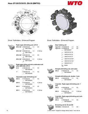 Haas ST-20/25/30/35, DS-30 (BMT65) Driven Toolholders - Enhanced Program Driven Toolholders - Enhanced Program Right angle drill/milling unit, LF=72 Gear hobbing unit ER-25 QF 420525010-65 1:2 EC Type 16-1 411500003-65 1:1 EC 0067725001 Type 16-1 411500002-65 2:1 EC 00675000927 ER-25 QF 420525011-65 1:2 IC 80 bar 0067725001 160016161 Ø 16 ER-32 QF 420532027-65 2:1 EC 160022161 Ø 22 0067732000 160027161 Ø 27 ER-32 QF 420532028-65 2:1 IC 80 bar 160015161 Ø 5/8" 0067732000 160019161 Ø 3/4" 160025161 Ø 1" Right angle milling unit with combination mill arbor DIN 6358, LF=72 96394 Ø 22 410622001-65 1:1 EC 00675000483 Straight drill/milling unit, both sides ER 25 413002001-65 1:1 EC 1" 410625001-65 1:1 EC 00675000907 00675000483 Adjustable angle drill/milling unit Straight drill/milling unit, double, Y axis ER 16 411010002-65 1:1 EC ER 25 413002004-65 1:1 EC 00675000902 00675000907 ER 16 411010003-65 1:1 IC 80 bar 00675000902 2-spindle - Right angle drill/milling unit, Y axis ER 11 411007002-65 1:2 EC 00675000914 ER 25 413502006-65 1:1 EC 00675000915 ER 11 411007003-65 1:2 IC 80 bar 00675000914 ER 25 413502007-65 1:1 IC 80 bar 00675000915 2-spindle - Right angle drill/milling unit, both sides, Y axis ER 25 413502008-65 1:1 EC 00675000915 Broaching unit for ID and OD TN765050 414532001-65 1:1 EC 10 © WTO GmbH * Subject to change without notice * www.wto.de