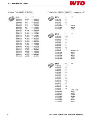 Accessories - Collets Collets DIN 6499B (ER/ESX) Collets DIN 6499D (ER/ESX) - sealed, for IC ER 40 mm inch ER 11 mm inch 190040000 ø 26-3 ø 1.024-0.118 191011030 ø3 190040040 ø 4-3 ø 0.157-0.118 191011040 ø4 190040050 ø 5-4 ø 0.197-0.157 191011050 ø5 190040060 ø 6-5 ø 0.236-0.197 191011060 ø6 190040070 ø 7-6 ø 0.276-0.236 191111013-in ø 0.125 190040080 ø 8-7 ø 0.315-0.276 191111019-in ø 0.188 190040090 ø 9-8 ø 0.354-0.315 191111025-in ø 0.25 190040100 ø 10-9 ø 0.394-0.354 190040110 ø 11-10 ø 0.433-0.394 190040120 ø 12-11 ø 0.472-0.433 ER 16 mm inch 190040130 ø 13-12 ø 0.512-0.472 190040140 ø 14-13 ø 0.551-0.512 191016000 ø 3-10 190040150 ø 15-14 ø 0.591-0.551 191016030 ø3 190040160 ø 16-15 ø 0.630-0.591 191016040 ø4 190040170 ø 17-16 ø 0.669-0.630 191016050 ø5 190040180 ø 18-17 ø 0.709-0.669 191016060 ø6 190040190 ø 19-18 ø 0.748-0.709 191016070 ø7 190040200 ø 20-19 ø 0.787-0.748 191016080 ø8 190040210 ø 21-20 ø 0.827-0.787 191016090 ø9 190040220 ø 22-21 ø 0.866-0.827 191016100 ø 10 190040230 ø 23-22 ø 0.906-0.866 191116001 ø 0.125-0.375 190040240 ø 24-23 ø 0.945-0.906 191116013-in ø 0.125 190040250 ø 25-24 ø 0.984-0.945 191116019-in ø 0.188 190040260 ø 26-25 ø 1.024-0.984 191116025-in ø 0.25 191116031-in ø 0.313 191116038-in ø 0.375 ER 25 mm inch 191025000 ø 4-16 191025030 ø3 191025040 ø4 191025050 ø5 191025060 ø6 191025070 ø7 191025080 ø8 191025090 ø9 191025100 ø 10 191025110 ø 11 191025120 ø 12 191025130 ø 13 191025140 ø 14 191025150 ø 15 191025160 ø 16 191125001 ø 0.25-0.625 191125025-in ø 0.25 191125031-in ø 0.313 191125038-in ø 0.375 191125044-in ø 0.438 191125050-in ø 0.5 191125056-in ø 0.563 191125063-in ø 0.625 14 © WTO GmbH * Subject to change without notice * www.wto.de