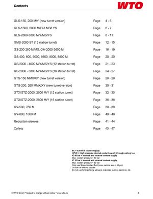 Contents GLS-150, 200 M/Y (new turret version) Page 4-5 GLS-1500, 2000 M/LY/LMS/LYS Page 6-7 GLS-2800-3300 M/Y/MS/YS Page 8 - 11 GMS-2000 ST (15 station turret) Page 12 - 15 GS-200-280 M/MS, GA-2000-3600 M Page 16 - 19 GS-400, 600, 6000, 6600, 8000, 8800 M Page 20 - 20 GS-2000 - 4000 M/Y/MS/YS (12 station turret) Page 21 - 23 GS-2000 - 3300 M/Y/MS/YS (16 station turret) Page 24 - 27 GTS-150 MMX/XY (new turret version) Page 28 - 29 GTS-200, 260 MMX/XY (new turret version) Page 30 - 31 GTX/GTZ-2000, 2600 M/Y (12 station turret) Page 32 - 35 GTX/GTZ-2000, 2600 M/Y (16 station turret) Page 36 - 38 GV-500, 780 M Page 39 - 39 GV-800, 1000 M Page 40 - 40 Reduction sleeves Page 41 - 44 Collets Page 45 - 47 EC = External coolant supply HP-IC = High pressure internal coolant supply through cutting tool IC 80 bar = Internal and external coolant supply Max. coolant pressure = 80 bar IC 30 bar = Internal and external coolant supply Max. coolant pressure = 30 bar Only use filtered coolant fluid (max. particle size = 50 µm) Do not run without coolant Do not use for machining abrasive materials such as cast iron, etc. © WTO GmbH * Subject to change without notice * www.wto.de 3