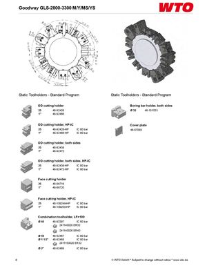 Goodway GLS-2800-3300 M/Y/MS/YS Static Toolholders - Standard Program Static Toolholders - Standard Program OD cutting holder Boring bar holder, both sides 25 48-92428 Ø 32 48-101033 1" 48-92466 OD cutting holder, HP-IC Cover plate 25 48-92428-HP IC 80 bar 48-87089 1" 48-92466-HP IC 80 bar OD cutting holder, both sides 25 48-92438 1" 48-92472 OD cutting holder, both sides, HP-IC 25 48-92438-HP IC 80 bar 1" 48-92472-HP IC 80 bar Face cutting holder 25 48-86719 1" 48-86720 Face cutting holder, HP-IC 25 48-109249-HP IC 80 bar 1" 48-109250-HP IC 80 bar Combination toolholder, LF=100 Ø 40 48-92397 IC 80 bar 241140020 ER32 241140026 ER40 Ø 50 48-92467 IC 80 bar Ø 1 1/2" 48-92468 IC 80 bar 2411150020 ER32 Ø 2" 48-92469 IC 80 bar 8 © WTO GmbH * Subject to change without notice * www.wto.de