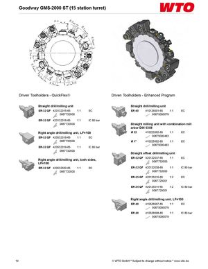 Goodway GMS-2000 ST (15 station turret) Driven Toolholders - QuickFlex® Driven Toolholders - Enhanced Program Straight drill/milling unit Straight drill/milling unit ER-32 QF 420132015-65 1:1 EC ER 40 410126001-65 1:1 EC 0067732000 00675000079 ER-32 QF 420132016-65 1:1 IC 80 bar 0067732000 Straight milling unit with combination mill arbor DIN 6358 Right angle drill/milling unit, LF=100 Ø 22 410222002-65 1:1 EC ER-32 QF 420532018-65 1:1 EC 00675000483 0067732000 Ø 1" 410225002-65 1:1 EC 00675000483 ER-32 QF 420532019-65 1:1 IC 80 bar 0067732000 Straight offset drill/milling unit Right angle drill/milling unit, both sides,LF=100 ER-32 QF 420132037-65 1:1 EC0067732000 ER-32 QF 420532020-65 1:1 EC ER-32 QF 420132038-65 1:1 IC 80 bar 0067732000 0067732000 ER-25 QF 420125010-65 1:2 EC 0067725001 ER-25 QF 420125011-65 1:2 IC 80 bar 0067725001 Right angle drill/milling unit, LF=100 ER 40 410526007-65 1:1 EC 00675000079 ER 40 410526008-65 1:1 IC 80 bar 00675000079 14 © WTO GmbH * Subject to change without notice * www.wto.de