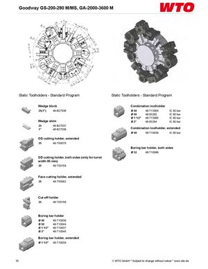 Goodway GS-200-280 M/MS, GA-2000-3600 M Static Toolholders - Standard Program Static Toolholders - Standard Program Wedge block Combination toolholder 25(1") 48-B27036 Ø 40 48-T13064 IC 80 bar Ø 50 48-83292 IC 80 bar Ø 1 1/2" 48-T13065 IC 80 bar Wedge shim Ø 2" 48-83294 IC 80 bar 25 48-B27037 1" 48-B27038 Combination toolholder, extended Ø 40 48-T10038 IC 80 bar OD cutting holder, extended 25 48-T00076 Boring bar holder, both sides Ø 32 48-T10086 OD cutting holder, both sides (only for turret width 85 mm) 25 48-T00158 Face cutting holder, extended 25 48-T00082 Cut-off holder 25 48-T00156 Boring bar holder Ø 40 48-T10036 Ø 50 48-T10044 Ø 1 1/2" 48-T10037 Ø 2" 48-T10045 Boring bar holder, extended Ø 1 1/2" 48-T10039 16 © WTO GmbH * Subject to change without notice * www.wto.de