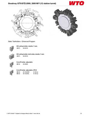 Goodway GTX/GTZ-2000, 2600 M/Y (12 station turret) Static Toolholders - Enhanced Program OD cutting holder, double, Y axis 25(1") 48-86103 OD cutting holder, both sides, double, Y axis 25(1") 48-86150 Cut-off holder, adjustable SH 32 48-99060 Cut-off holder, adjustable, HP-IC SH 32 48-102256R IC 80 bar SH 32 48-102256L IC 80 bar © WTO GmbH * Subject to change without notice * www.wto.de 33