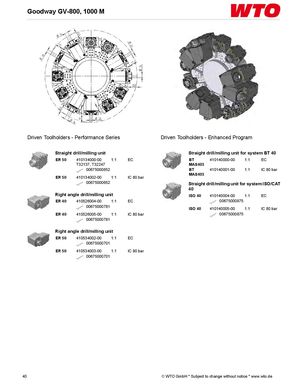 Goodway GV-800, 1000 M Driven Toolholders - Performance Series Driven Toolholders - Enhanced Program Straight drill/milling unit Straight drill/milling unit for system BT 40 ER 50 410134000-00 1:1 EC BT 410140000-00 1:1 EC T32137, T32247 MAS403 00675000652 BT 410140001-00 1:1 IC 80 bar MAS403 ER 50 410134002-00 1:1 IC 80 bar 00675000652 Straight drill/milling unit for system ISO/CAT 40 Right angle drill/milling unit ISO 40 410140004-00 1:1 EC ER 40 410526004-00 1:1 EC 00675000875 00675000781 ISO 40 410140005-00 1:1 IC 80 bar ER 40 410526005-00 1:1 IC 80 bar 00675000875 00675000781 Right angle drill/milling unit ER 50 410534002-00 1:1 EC 00675000701 ER 50 410534003-00 1:1 IC 80 bar 00675000701 40 © WTO GmbH * Subject to change without notice * www.wto.de
