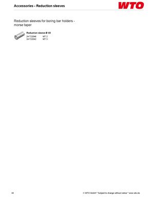 Accessories - Reduction sleeves Reduction sleeves for boring bar holders - morse taper Reduction sleeve Ø 40 24-T22046 MT 2 24-T22042 MT 3 44 © WTO GmbH * Subject to change without notice * www.wto.de
