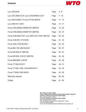 Contents Lynx 220 M/LM Page 4-6 Lynx 220 LMS/LY/LSY, Lynx 2100 M/MS/LY/LSY Page 7 - 10 Lynx 300 M,2600 Y, Puma GT2100,2600 M Page 11 - 13 Lynx 2600 SY (12ST) Page 14 - 17 Puma 2100,2600(II) M/MS/Y/SY (BMT55) Page 18 - 23 Puma 2100,2600(II) M/MS/Y/SY (BMT65) Page 24 - 27 Puma 2100,2600 Y/SY, Lynx 2600 Y/SY (16ST, BMT55) Page 28 - 30 Puma 3100 M/Y, GT3100 M Page 31 - 33 Puma 4100, 5100 M/LM/LY Page 34 - 35 Puma 600, 700, 800 M/LM/LY Page 36 - 37 Puma MX1600 ST (BMT45) Page 38 - 41 Puma MX1600, 2100 ST (BMT55) Page 42 - 44 Puma SMX2600, 3100 ST Page 45 - 48 Puma TT1300 SY/SYY Page 49 - 51 Puma TT1500, 1800, 2100 MS/SY/SYY Page 52 - 54 Puma TT2000, 2500 MS/SY Page 55 - 58 Reduction sleeves Page 59 - 60 Collets Page 61 - 63 EC = External coolant supply HP-IC = High pressure internal coolant supply through cutting tool IC 80 bar = Internal and external coolant supply Max. coolant pressure = 80 bar IC 30 bar = Internal and external coolant supply Max. coolant pressure = 30 bar Only use filtered coolant fluid (max. particle size = 50 µm) Do not run without coolant Do not use for machining abrasive materials such as cast iron, etc. © WTO GmbH * Subject to change without notice * www.wto.de 3
