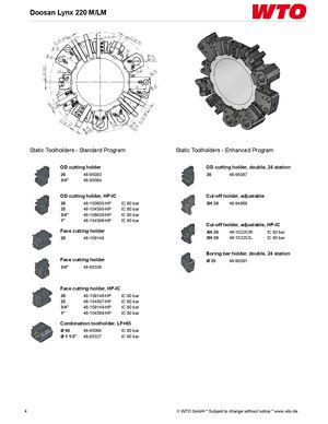 Doosan Lynx 220 M/LM Static Toolholders - Standard Program Static Toolholders - Enhanced Program OD cutting holder OD cutting holder, double, 24 station 20 48-95083 20 48-95087 3/4" 48-95084 OD cutting holder, HP-IC Cut-off holder, adjustable 20 48-100605-HP IC 80 bar SH 26 48-94968 25 48-104395-HP IC 80 bar 3/4" 48-108926-HP IC 80 bar 1" 48-104396-HP IC 80 bar Cut-off holder, adjustable, HP-IC Face cutting holder SH 26 48-102252R IC 80 bar 20 48-109148 SH 26 48-102252L IC 80 bar Boring bar holder, double, 24 station Face cutting holder Ø 25 48-95091 3/4" 48-95338 Face cutting holder, HP-IC 20 48-109148-HP IC 80 bar 25 48-104397-HP IC 80 bar 3/4" 48-109149-HP IC 80 bar 1" 48-104398-HP IC 80 bar Combination toolholder, LF=65 Ø 40 48-95090 IC 80 bar Ø 1 1/2" 48-95327 IC 80 bar 4 © WTO GmbH * Subject to change without notice * www.wto.de