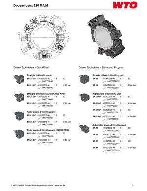 Doosan Lynx 220 M/LM Driven Toolholders - QuickFlex® Driven Toolholders - Enhanced Program Straight drill/milling unit Straight offset drill/milling unit ER-25 QF 420125015-45 1:1 EC ER 16 410410008-45 1:3 EC 0067725000 00675000937 ER-25 QF 420125016-45 1:1 IC 80 bar ER 16 410410002-45 1:3 IC 80 bar 0067725000 00675000937 Straight drill/milling unit (12000 RPM) Right angle drill/milling unit ER-25 QF 420125019-45 1:1 EC ER-20 QF 420520018-45 1:2 EC 0067725000 0067720001 ER-25 QF 420125020-45 1:1 IC 80 bar ER-20 QF 420520019-45 1:2 IC 80 bar 0067725000 0067720001 ER-25 QF 420525020-45 2:1 EC Right angle drill/milling unit 0067725000 ER-25 QF 420525015-45 1:1 EC ER-25 QF 420525021-45 2:1 IC 80 bar 0067725000 0067725000 ER-25 QF 420525016-45 1:1 IC 80 bar 0067725000 Adjustable angle drill/milling unit ER 16 411010002-45 1:1 EC Right angle drill/milling unit (12000 RPM) 00675000902 ER-25 QF 420525038-45 1:1 EC ER 16 411010003-45 1:1 IC 80 bar 0067725000 00675000902 ER-25 QF 420525039-45 1:1 IC 80 bar ER 11 411007004-45 1:2 EC 0067725000 00675000914 ER 11 411007005-45 1:2 IC 80 bar 00675000914 © WTO GmbH * Subject to change without notice * www.wto.de 5