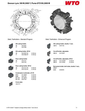 Doosan Lynx 300 M,2600 Y, Puma GT2100,2600 M Static Toolholders - Standard Program Static Toolholders - Enhanced Program OD cutting holder OD cutting holder, double, Y axis 25 48-87097 25(1") 48-87140 1" 48-87098 OD cutting holder, HP-IC Cut-off holder, adjustable 25 48-87097-HP IC 80 bar SH 32 48-103287 1" 48-87098-HP IC 80 bar Face cutting holder Cut-off holder, adjustable, HP-IC 25 48-87101 SH 32 48-110160R IC 80 bar 1" 48-87102 SH 32 48-110160L IC 80 bar Face cutting holder, HP-IC Boring bar holder, both sides, double, Y axis, 25 48-87101-HP IC 80 bar short 1" 48-87102-HP IC 80 bar Ø 25 48-98353 Combination toolholder, LF=70 Ø 32 48-106897 IC 80 bar Ø 40 48-87103 IC 80 bar Ø 1 1/4" 48-106872 IC 80 bar Ø 1 1/2" 48-87104 IC 80 bar Cover plate 48-87111 © WTO GmbH * Subject to change without notice * www.wto.de 11