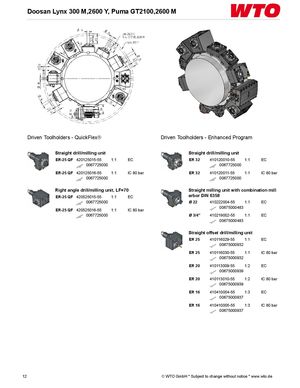 Doosan Lynx 300 M,2600 Y, Puma GT2100,2600 M Driven Toolholders - QuickFlex® Driven Toolholders - Enhanced Program Straight drill/milling unit Straight drill/milling unit ER-25 QF 420125015-55 1:1 EC ER 32 410120010-55 1:1 EC 0067725000 0067725000 ER-25 QF 420125016-55 1:1 IC 80 bar ER 32 410120011-55 1:1 IC 80 bar 0067725000 0067725000 Right angle drill/milling unit, LF=70 Straight milling unit with combination mill ER-25 QF 420525015-55 1:1 EC arbor DIN 6358 0067725000 Ø 22 410222004-55 1:1 EC ER-25 QF 420525016-55 1:1 IC 80 bar 00675000483 0067725000 Ø 3/4" 410219002-55 1:1 EC 00675000483 Straight offset drill/milling unit ER 25 410116029-55 1:1 EC 00675000932 ER 25 410116030-55 1:1 IC 80 bar 00675000932 ER 20 410113009-55 1:2 EC 00675000939 ER 20 410113010-55 1:2 IC 80 bar 00675000939 ER 16 410410004-55 1:3 EC 00675000937 ER 16 410410005-55 1:3 IC 80 bar 00675000937 12 © WTO GmbH * Subject to change without notice * www.wto.de