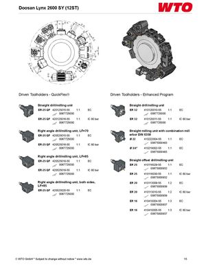 Doosan Lynx 2600 SY (12ST) Driven Toolholders - QuickFlex® Driven Toolholders - Enhanced Program Straight drill/milling unit Straight drill/milling unit ER-25 QF 420125015-55 1:1 EC ER 32 410120010-55 1:1 EC 0067725000 0067725000 ER-25 QF 420125016-55 1:1 IC 80 bar ER 32 410120011-55 1:1 IC 80 bar 0067725000 0067725000 Right angle drill/milling unit, LF=70 Straight milling unit with combination mill ER-25 QF 420525015-55 1:1 EC arbor DIN 6358 0067725000 Ø 22 410222004-55 1:1 EC ER-25 QF 420525016-55 1:1 IC 80 bar 00675000483 0067725000 Ø 3/4" 410219002-55 1:1 EC 00675000483 Right angle drill/milling unit, LF=85 ER-25 QF 420525018-55 1:1 EC Straight offset drill/milling unit 0067725000 ER 25 410116029-55 1:1 EC 00675000932 ER-25 QF 420525019-55 1:1 IC 80 bar 0067725000 ER 25 410116030-55 1:1 IC 80 bar 00675000932 Right angle drill/milling unit, both sides, ER 20 410113009-55 1:2 EC LF=85 00675000939 ER-25 QF 420525020-55 1:1 EC ER 20 410113010-55 1:2 IC 80 bar 0067725000 00675000939 ER 16 410410004-55 1:3 EC 00675000937 ER 16 410410005-55 1:3 IC 80 bar 00675000937 © WTO GmbH * Subject to change without notice * www.wto.de 15