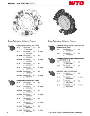 Doosan Lynx 2600 SY (12ST) Driven Toolholders - Enhanced Program Driven Toolholders - Enhanced Program Right angle drill/milling unit, LF=70 Right angle milling unit with combination mill ER 32 410520033-55 1:1 EC arbor DIN 6358, LF=70 0067725000 Ø 22 410622010-55 1:1 EC ER 32 410520034-55 1:1 IC 80 bar 00675000483 0067725000 Ø 3/4" 410619005-55 1:1 EC ER-20 QF 420520012-55 1:2 EC 00675000483 0067720001 Right angle milling unit with combination mill ER-20 QF 420520013-55 1:2 IC 80 bar arbor DIN 6358, LF=85 0067720001 Ø 22 410622011-55 1:1 EC ER 16 410810016-55 1:3 EC 00675000483 00675000841 Ø 3/4" 410619006-55 1:1 EC ER 16 410810017-55 1:3 IC 80 bar 00675000483 00675000841 ER-25 QF 420525030-55 2:1 EC Adjustable angle drill/milling unit 0067725000 ER 16 411010005-55 1:1 EC ER-25 QF 420525031-55 2:1 IC 80 bar 00675000902 0067725000 ER 16 411010006-55 1:1 IC 80 bar 00675000902 Right angle drill/milling unit, LF=85 ER 11 411007007-55 1:2 EC ER 32 410520030-55 1:1 EC 00675000914 0067725000 ER 11 411007008-55 1:2 IC 80 bar ER 32 410520031-55 1:1 IC 80 bar 00675000914 0067725000 ER-20 QF 420520014-55 1:2 EC 0067720001 ER-20 QF 420520015-55 1:2 IC 80 bar 0067720001 ER 16 410810020-55 1:3 EC 00675000841 ER 16 410810021-55 1:3 IC 80 bar 00675000841 ER-25 QF 420525032-55 2:1 EC 0067725000 ER-25 QF 420525033-55 2:1 IC 80 bar 0067725000 16 © WTO GmbH * Subject to change without notice * www.wto.de