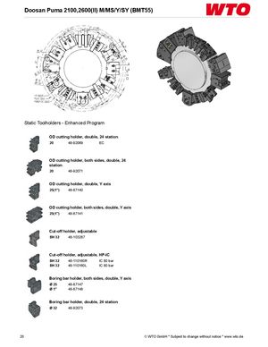 Doosan Puma 2100,2600(II) M/MS/Y/SY (BMT55) Static Toolholders - Enhanced Program OD cutting holder, double, 24 station 20 48-92069 EC OD cutting holder, both sides, double, 24 station 20 48-92071 OD cutting holder, double, Y axis 25(1") 48-87140 OD cutting holder, both sides, double, Y axis 25(1") 48-87141 Cut-off holder, adjustable SH 32 48-103287 Cut-off holder, adjustable, HP-IC SH 32 48-110160R IC 80 bar SH 32 48-110160L IC 80 bar Boring bar holder, both sides, double, Y axis Ø 25 48-87147 Ø 1" 48-87148 Boring bar holder, double, 24 station Ø 32 48-92073 20 © WTO GmbH * Subject to change without notice * www.wto.de