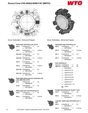 Doosan Puma 2100,2600(II) M/MS/Y/SY (BMT55) Driven Toolholders - Enhanced Program Driven Toolholders - Enhanced Program Right angle drill/milling unit, LF=70 Adjustable angle drill/milling unit ER 32 410520033-55 1:1 EC ER 16 411010005-55 1:1 EC 0067725000 00675000902 ER 32 410520034-55 1:1 IC 80 bar ER 16 411010006-55 1:1 IC 80 bar 0067725000 00675000902 ER-20 QF 420520012-55 1:2 EC ER 11 411007007-55 1:2 EC 0067720001 00675000914 ER-20 QF 420520013-55 1:2 IC 80 bar ER 11 411007008-55 1:2 IC 80 bar 0067720001 00675000914 ER 16 410810016-55 1:3 EC 00675000841 Gear hobbing unit ER 16 410810017-55 1:3 IC 80 bar Type 16-1 411500002-55 1:1 EC 00675000841 Type 16-1 411500001-55 2:1 EC 00675000927 ER-25 QF 420525030-55 2:1 EC 0067725000 160016161 Ø 16 ER-25 QF 420525031-55 2:1 IC 80 bar 160022161 Ø 22 0067725000 160027161 Ø 27 160015161 Ø 5/8" Right angle milling unit with combination mill arbor DIN 6358, LF=70 160019161 Ø 3/4" Ø 22 410622010-55 1:1 EC 160025161 Ø 1" 00675000483 160031161 Ø 1 1/4" Ø 3/4" 410619005-55 1:1 EC00675000483 110587 Right angle back set drill/milling unit Straight drill/milling unit, double, Y axis ER 25 410516024-55 1:1 EC ER 25 413002004-55 1:1 EC 00675000801 00675000970 ER 25 410516025-55 1:1 IC 80 bar00675000801 ER 25 413002003-55 1:1 IC 80 bar00675000970 2-spindle - Right angle drill/milling unit, Y axis ER 25 413502007-55 1:1 EC 00675000915 ER 25 413502008-55 1:1 IC 80 bar 22 © WTO GmbH * Subject to change without notice * www.wto.de 00675000915