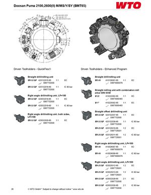Doosan Puma 2100,2600(II) M/MS/Y/SY (BMT65) Driven Toolholders - QuickFlex® Driven Toolholders - Enhanced Program Straight drill/milling unit Straight drill/milling unit ER-32 QF 420132015-65 1:1 EC ER 40 410126001-65 1:1 EC 0067732000 00675000079 ER-32 QF 420132016-65 1:1 IC 80 bar 0067732000 Straight milling unit with combination mill arbor DIN 6358 Right angle drill/milling unit, LF=100 Ø 22 410222002-65 1:1 EC ER-32 QF 420532018-65 1:1 EC 00675000483 0067732000 Ø 1" 410225002-65 1:1 EC ER-32 QF 420532019-65 1:1 IC 80 bar 00675000483 0067732000 Straight offset drill/milling unit Right angle drill/milling unit, both sides, ER-32 QF 420132037-65 1:1 EC LF=100 0067732000 ER-32 QF 420532020-65 1:1 EC ER-32 QF 420132038-65 1:1 IC 80 bar 0067732000 0067732000 ER-25 QF 420125010-65 1:2 EC 0067725001 ER-25 QF 420125011-65 1:2 IC 80 bar 0067725001 Right angle drill/milling unit, LF=100 ER 40 410526007-65 1:1 EC 00675000079 ER 40 410526008-65 1:1 IC 80 bar 00675000079 Right angle drill/milling unit, LF=100 ER-25 QF 420525012-65 1:2 EC 0067725001 ER-25 QF 420525013-65 1:2 IC 80 bar 0067725001 ER-32 QF 420532029-65 2:1 EC 0067732000 ER-32 QF 420532030-65 2:1 IC 80 bar 26 © WTO GmbH * Subject to change without notice * www.wto.de 0067732000
