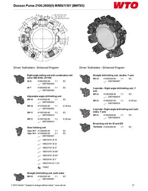 Doosan Puma 2100,2600(II) M/MS/Y/SY (BMT65) Driven Toolholders - Enhanced Program Driven Toolholders - Enhanced Program Right angle milling unit with combination mill Straight drill/milling unit, double, Y axis arbor DIN 6358, LF=100 ER 25 413002004-65 1:1 EC Ø 22 410622002-65 1:1 EC 00675000907 00675000483 Ø 1" 410625002-65 1:1 EC 2-spindle - Right angle drill/milling unit, Y 00675000483 axis ER 25 413502006-65 1:1 EC Adjustable angle drill/milling unit 00675000915 ER 16 411010002-65 1:1 EC ER 25 413502007-65 1:1 IC 80 bar 00675000902 00675000915 ER 16 411010003-65 1:1 IC 80 bar 00675000902 2-spindle - Right angle drill/milling unit, both ER 11 411007002-65 1:2 EC sides, Y axis 00675000914 ER 25 413502008-65 1:1 EC ER 11 411007003-65 1:2 IC 80 bar 00675000915 00675000914 Broaching unit for ID and OD Gear hobbing unit TN765050 414532000-65 1:1 EC Type 16-1 411500003-65 1:1 EC Type 16-1 411500002-65 2:1 EC 00675000927 160016161 Ø 16 160022161 Ø 22 160027161 Ø 27 160015161 Ø 5/8" 160019161 Ø 3/4" 160025161 Ø 1" 160031161 Ø 1 1/4" 110587 Straight drill/milling unit, both sides ER 25 413002001-65 1:1 EC 00675000907 © WTO GmbH * Subject to change without notice * www.wto.de 27