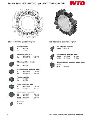 Doosan Puma 2100,2600 Y/SY, Lynx 2600 Y/SY (16ST, BMT55) Static Toolholders - Standard Program Static Toolholders - Enhanced Program OD cutting holder Cut-off holder, adjustable 20 48-92036 SH 32 48-103287 3/4" 48-92037 OD cutting holder, HP-IC Cut-off holder, adjustable, HP-IC 20 48-92036-HP IC 80 bar SH 32 48-110160R IC 80 bar 3/4" 48-92037-HP IC 80 bar SH 32 48-110160L IC 80 bar OD cutting holder, both sides Boring bar holder, both sides, double, Y axis, 20 48-92038 short 3/4" 48-92039 Ø 25 48-98353 OD cutting holder, both sides, HP-IC 20 48-92038-HP IC 80 bar 3/4" 48-92039-HP IC 80 bar Face cutting holder 20 48-92045 3/4" 48-92046 Face cutting holder, HP-IC 20 48-92045-HP IC 80 bar 3/4" 48-92046-HP IC 80 bar Combination toolholder, LF=70 Ø 32 48-106897 IC 80 bar Ø 40 48-87103 IC 80 bar Ø 1 1/4" 48-106872 IC 80 bar Ø 1 1/2" 48-87104 IC 80 bar Cover plate 48-87111 28 © WTO GmbH * Subject to change without notice * www.wto.de