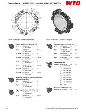 Doosan Puma 2100,2600 Y/SY, Lynx 2600 Y/SY (16ST, BMT55) Driven Toolholders - Enhanced Program Driven Toolholders - Enhanced Program Right angle drill/milling unit, LF=70 Adjustable angle drill/milling unit ER 32 410520033-55 1:1 EC ER 16 411010005-55 1:1 EC 0067725000 00675000902 ER 32 410520034-55 1:1 IC 80 bar ER 16 411010006-55 1:1 IC 80 bar 0067725000 00675000902 ER-20 QF 420520012-55 1:2 EC ER 11 411007007-55 1:2 EC 0067720001 00675000914 ER-20 QF 420520013-55 1:2 IC 80 bar ER 11 411007008-55 1:2 IC 80 bar 0067720001 00675000914 ER 16 410810016-55 1:3 EC 00675000841 Gear hobbing unit ER 16 410810017-55 1:3 IC 80 bar Type 15-2 410900002-55 1:1 EC 00675000841 00675001015 ER-25 QF 420525030-55 2:1 EC 160008152 Ø 8 0067725000 160010152 Ø 10 ER-25 QF 420525031-55 2:1 IC 80 bar 160013152 Ø 13 0067725000 160016152 Ø 16 Right angle milling unit with combination mill 160022152 Ø 22 arbor DIN 6358, LF=70 160015152 Ø 5/8" Ø 22 410622010-55 1:1 EC 00675000483 160019152 Ø 3/4" Ø 3/4" 410619005-55 1:1 EC 110587 00675000483 Broaching unit for ID and OD Right angle back set drill/milling unit TN765050 414532001-55 1:1 EC ER 25 410516024-55 1:1 EC 00675000801 ER 25 410516025-55 1:1 IC 80 bar 00675000801 30 © WTO GmbH * Subject to change without notice * www.wto.de