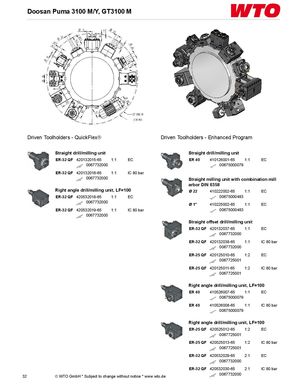 Doosan Puma 3100 M/Y, GT3100 M Driven Toolholders - QuickFlex® Driven Toolholders - Enhanced Program Straight drill/milling unit Straight drill/milling unit ER-32 QF 420132015-65 1:1 EC ER 40 410126001-65 1:1 EC 0067732000 00675000079 ER-32 QF 420132016-65 1:1 IC 80 bar 0067732000 Straight milling unit with combination mill arbor DIN 6358 Right angle drill/milling unit, LF=100 Ø 22 410222002-65 1:1 EC ER-32 QF 420532018-65 1:1 EC 00675000483 0067732000 Ø 1" 410225002-65 1:1 EC ER-32 QF 420532019-65 1:1 IC 80 bar 00675000483 0067732000 Straight offset drill/milling unit ER-32 QF 420132037-65 1:1 EC 0067732000 ER-32 QF 420132038-65 1:1 IC 80 bar 0067732000 ER-25 QF 420125010-65 1:2 EC 0067725001 ER-25 QF 420125011-65 1:2 IC 80 bar 0067725001 Right angle drill/milling unit, LF=100 ER 40 410526007-65 1:1 EC 00675000079 ER 40 410526008-65 1:1 IC 80 bar 00675000079 Right angle drill/milling unit, LF=100 ER-25 QF 420525012-65 1:2 EC 0067725001 ER-25 QF 420525013-65 1:2 IC 80 bar 0067725001 ER-32 QF 420532029-65 2:1 EC 0067732000 ER-32 QF 420532030-65 2:1 IC 80 bar 32 © WTO GmbH * Subject to change without notice * www.wto.de 0067732000