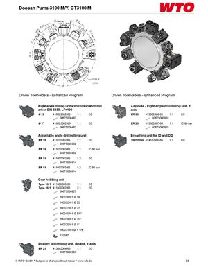 Doosan Puma 3100 M/Y, GT3100 M Driven Toolholders - Enhanced Program Driven Toolholders - Enhanced Program Right angle milling unit with combination mill 2-spindle - Right angle drill/milling unit, Y arbor DIN 6358, LF=100 axis Ø 22 410622002-65 1:1 EC ER 25 413502006-65 1:1 EC 00675000483 00675000915 Ø 1" 410625002-65 1:1 EC ER 25 413502007-65 1:1 IC 80 bar 00675000483 00675000915 Adjustable angle drill/milling unit Broaching unit for ID and OD ER 16 411010002-65 1:1 EC TN765050 414532000-65 1:1 EC 00675000902 ER 16 411010003-65 1:1 IC 80 bar 00675000902 ER 11 411007002-65 1:2 EC 00675000914 ER 11 411007003-65 1:2 IC 80 bar 00675000914 Gear hobbing unit Type 16-1 411500003-65 1:1 EC Type 16-1 411500002-65 2:1 EC 00675000927 160016161 Ø 16 160022161 Ø 22 160027161 Ø 27 160015161 Ø 5/8" 160019161 Ø 3/4" 160025161 Ø 1" 160031161 Ø 1 1/4" 110587 Straight drill/milling unit, double, Y axis ER 25 413002004-65 1:1 EC 00675000907 © WTO GmbH * Subject to change without notice * www.wto.de 33