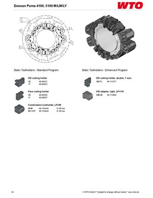 Doosan Puma 4100, 5100 M/LM/LY Static Toolholders - Standard Program Static Toolholders - Enhanced Program OD cutting holder OD cutting holder, double, Y axis 25 48-96421 25(1") 48-112317 1" 48-96422 Face cutting holder VDI adapter, right, LF=110 25 48-96355 VDI 50 48-112600 1" 48-96357 Combination toolholder, LF=90 Ø 60 48-104448 IC 80 bar Ø 2 1/2" 48-104449 IC 80 bar 34 © WTO GmbH * Subject to change without notice * www.wto.de