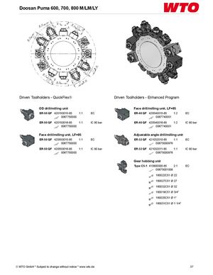 Doosan Puma 600, 700, 800 M/LM/LY Driven Toolholders - QuickFlex® Driven Toolholders - Enhanced Program OD drill/milling unit Face drill/milling unit, LF=85 ER-50 QF 420150015-85 1:1 EC ER-40 QF 420540015-85 1:2 EC 0067750000 0067740001 ER-50 QF 420150016-85 1:1 IC 80 bar ER-40 QF 420540016-85 1:2 IC 80 bar 0067750000 0067740001 Face drill/milling unit, LF=85 Adjustable angle drill/milling unit ER-50 QF 420550015-85 1:1 EC ER-32 QF 421032010-85 1:1 EC 0067750000 00675000976 ER-50 QF 420550016-85 1:1 IC 80 bar ER-32 QF 421032011-85 1:1 IC 80 bar 0067750000 00675000976 Gear hobbing unit Type C5-1 410900000-85 2:1 EC 00675001008 160022C51 Ø 22 160027C51 Ø 27 160032C51 Ø 32 160019C51 Ø 3/4" 160025C51 Ø 1" 160031C51 Ø 1 1/4" © WTO GmbH * Subject to change without notice * www.wto.de 37