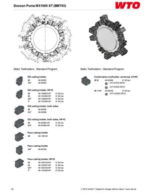 Doosan Puma MX1600 ST (BMT45) Static Toolholders - Standard Program Static Toolholders - Standard Program OD cutting holder Combination toolholder, universal, LF=85 20 48-95083 Ø 32 48-95998 IC 80 bar 3/4" 48-95084 241132016 ER25 241132020 ER32 OD cutting holder, HP-IC Ø 1 1/4" 48-96029 IC 80 bar 20 48-100605-HP IC 80 bar 2411125020 ER32 25 48-104395-HP IC 80 bar 3/4" 48-108926-HP IC 80 bar 1" 48-104396-HP IC 80 bar OD cutting holder, both sides 20 48-95085 3/4" 48-95086 OD cutting holder, both sides, HP-IC 20 48-95085-HP IC 80 bar 3/4" 48-95086-HP IC 80 bar Face cutting holder 20 48-109148 Face cutting holder 3/4" 48-95338 Face cutting holder, HP-IC 20 48-109148-HP IC 80 bar 25 48-104397-HP IC 80 bar 3/4" 48-109149-HP IC 80 bar 1" 48-104398-HP IC 80 bar 38 © WTO GmbH * Subject to change without notice * www.wto.de