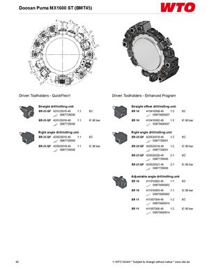 Doosan Puma MX1600 ST (BMT45) Driven Toolholders - QuickFlex® Driven Toolholders - Enhanced Program Straight drill/milling unit Straight offset drill/milling unit ER-25 QF 420125015-45 1:1 EC ER 16 410410008-45 1:3 EC 0067725000 00675000937 ER-25 QF 420125016-45 1:1 IC 80 bar ER 16 410410002-45 1:3 IC 80 bar 0067725000 00675000937 Right angle drill/milling unit Right angle drill/milling unit ER-25 QF 420525015-45 1:1 EC ER-20 QF 420520018-45 1:2 EC 0067725000 0067720001 ER-25 QF 420525016-45 1:1 IC 80 bar ER-20 QF 420520019-45 1:2 IC 80 bar 0067725000 0067720001 ER-25 QF 420525020-45 2:1 EC 0067725000 ER-25 QF 420525021-45 2:1 IC 80 bar 0067725000 Adjustable angle drill/milling unit ER 16 411010002-45 1:1 EC 00675000902 ER 16 411010003-45 1:1 IC 80 bar 00675000902 ER 11 411007004-45 1:2 EC 00675000914 ER 11 411007005-45 1:2 IC 80 bar 00675000914 40 © WTO GmbH * Subject to change without notice * www.wto.de