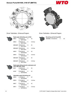 Doosan Puma MX1600, 2100 ST (BMT55) Driven Toolholders - Enhanced Program Driven Toolholders - Enhanced Program Right angle drill/milling unit, LF=85 Broaching unit for ID and OD ER 32 410520030-55 1:1 EC TN765050 414532000-55 1:1 EC 0067725000 ER 32 410520031-55 1:1 IC 80 bar 0067725000 ER-20 QF 420520014-55 1:2 EC 0067720001 ER-20 QF 420520015-55 1:2 IC 80 bar 0067720001 ER 16 410810020-55 1:3 EC 00675000841 ER 16 410810021-55 1:3 IC 80 bar 00675000841 ER-25 QF 420525032-55 2:1 EC 0067725000 ER-25 QF 420525033-55 2:1 IC 80 bar 0067725000 Right angle milling unit with combination mill arbor DIN 6358, LF=85 Ø 22 410622011-55 1:1 EC 00675000483 Ø 3/4" 410619006-55 1:1 EC 00675000483 Adjustable angle drill/milling unit ER 16 411010005-55 1:1 EC 00675000902 ER 16 411010006-55 1:1 IC 80 bar 00675000902 ER 11 411007007-55 1:2 EC 00675000914 ER 11 411007008-55 1:2 IC 80 bar 00675000914 44 © WTO GmbH * Subject to change without notice * www.wto.de