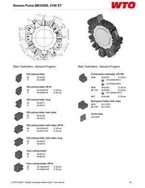 Doosan Puma SMX2600, 3100 ST Static Toolholders - Standard Program Static Toolholders - Standard Program OD cutting holder Combination toolholder, LF=100 25 48-92428 Ø 40 48-92397 IC 80 bar 1" 48-92466 241140020 ER32 241140026 ER40 OD cutting holder, HP-IC Ø 50 48-92467 IC 80 bar 25 48-92428-HP IC 80 bar Ø 1 1/2" 48-92468 IC 80 bar 1" 48-92466-HP IC 80 bar 2411150020 ER32 Ø 2" 48-92469 IC 80 bar OD cutting holder, long Boring bar holder, both sides 25 48-86711 1" 48-86712 Ø 32 48-101033 Ø 1 1/4" 48-113514 OD cutting holder, both sides Cover plate 25 48-92438 1" 48-92472 48-87089 OD cutting holder, both sides, HP-IC 25 48-92438-HP IC 80 bar 1" 48-92472-HP IC 80 bar OD cutting holder, both sides, long 25 48-84523 1" 48-86718 Face cutting holder 25 48-86719 1" 48-86720 Face cutting holder, HP-IC 25 48-109249-HP IC 80 bar 1" 48-109250-HP IC 80 bar © WTO GmbH * Subject to change without notice * www.wto.de 45
