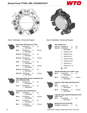 Doosan Puma TT1500, 1800, 2100 MS/SY/SYY Driven Toolholders - Enhanced Program Driven Toolholders - Enhanced Program Right angle drill/milling unit, LF=85 Gear hobbing unit ER 32 410520030-55 1:1 EC Type 16-1 411500002-55 1:1 EC 0067725000 Type 16-1 411500001-55 2:1 EC 00675000927 ER 32 410520031-55 1:1 IC 80 bar 0067725000 160016161 Ø 16 ER-20 QF 420520014-55 1:2 EC 160022161 Ø 22 0067720001 160027161 Ø 27 ER-20 QF 420520015-55 1:2 IC 80 bar0067720001 160015161 Ø 5/8" ER 16 410810020-55 1:3 EC 160019161 Ø 3/4" 00675000841 160025161 Ø 1" ER 16 410810021-55 1:3 IC 80 bar 160031161 Ø 1 1/4" 00675000841 110587 ER-25 QF 420525032-55 2:1 EC 0067725000 Straight drill/milling unit, double, Y axis ER-25 QF 420525033-55 2:1 IC 80 bar ER 25 413002004-55 1:1 EC 0067725000 00675000970 ER 25 413002003-55 1:1 IC 80 bar Right angle milling unit with combination mill 00675000970 arbor DIN 6358, LF=85 Ø 22 410622011-55 1:1 EC 2-spindle - Right angle drill/milling unit, Y 00675000483 axis Ø 3/4" 410619006-55 1:1 EC ER 25 413502007-55 1:1 EC 00675000483 00675000915 ER 25 413502008-55 1:1 IC 80 bar Adjustable angle drill/milling unit 00675000915 ER 16 411010005-55 1:1 EC 00675000902 2-spindle - Right angle drill/milling unit, both ER 16 411010006-55 1:1 IC 80 bar sides, Y axis 00675000902 ER 25 413502006-55 1:1 EC ER 11 411007007-55 1:2 EC 00675000915 00675000914 Broaching unit for ID and OD ER 11 411007008-55 1:2 IC 80 bar 00675000914 TN765050 414532000-55 1:1 EC 54 © WTO GmbH * Subject to change without notice * www.wto.de