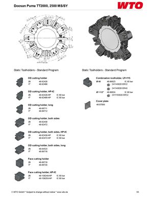 Doosan Puma TT2000, 2500 MS/SY Static Toolholders - Standard Program Static Toolholders - Standard Program OD cutting holder Combination toolholder, LF=115 25 48-92428 Ø 40 48-86623 IC 80 bar 1" 48-92466 241140020 ER32 241140026 ER40 OD cutting holder, HP-IC Ø 1 1/2" 48-86624 IC 80 bar 25 48-92428-HP IC 80 bar 2411150020 ER32 1" 48-92466-HP IC 80 bar Cover plate OD cutting holder, long 48-87089 25 48-86711 1" 48-86712 OD cutting holder, both sides 25 48-92438 1" 48-92472 OD cutting holder, both sides, HP-IC 25 48-92438-HP IC 80 bar 1" 48-92472-HP IC 80 bar OD cutting holder, both sides, long 25 48-84523 1" 48-86718 Face cutting holder 25 48-86719 1" 48-86720 Face cutting holder, HP-IC 25 48-109249-HP IC 80 bar 1" 48-109250-HP IC 80 bar © WTO GmbH * Subject to change without notice * www.wto.de 55
