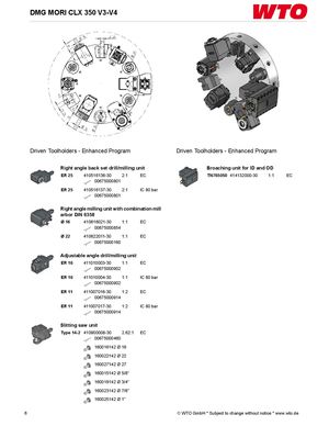 DMG MORI CLX 350 V3-V4 Driven Toolholders - Enhanced Program Driven Toolholders - Enhanced Program Right angle back set drill/milling unit Broaching unit for ID and OD ER 25 410516136-30 2:1 EC TN765050 414132000-30 1:1 EC 00675000801 ER 25 410516137-30 2:1 IC 80 bar 00675000801 Right angle milling unit with combination mill arbor DIN 6358 Ø 16 410616021-30 1:1 EC 00675000854 Ø 22 410622011-30 1:1 EC 00675000160 Adjustable angle drill/milling unit ER 16 411010003-30 1:1 EC 00675000902 ER 16 411010004-30 1:1 IC 80 bar 00675000902 ER 11 411007016-30 1:2 EC 00675000914 ER 11 411007017-30 1:2 IC 80 bar 00675000914 Slitting saw unit Type 14-2 410900008-30 2.62:1 EC 00675000460 160016142 Ø 16 160022142 Ø 22 160027142 Ø 27 160015142 Ø 5/8" 160019142 Ø 3/4" 160023142 Ø 7/8" 160025142 Ø 1" 6 © WTO GmbH * Subject to change without notice * www.wto.de