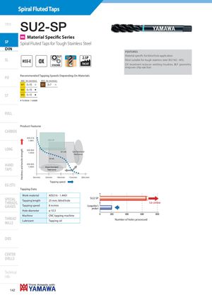 Hardness and tensile strength Spiral Fluted Taps Intro SU2-SP MS Material Specific Series SP Spiral Fluted Taps for Tough Stainless Steel DIN FEATURES SL HSS-E OX SYNCHRO 2.5PTHCHT Material specific for blind hole application.Most suitable for tough stainless steel (ISO M2 - M3).OX treatment reduces welding troubles, BLF geometry imrpoves chip ejection. PO Recommended Tapping Speeds Depending On Materials ISO Vc (m/min) ISO Vc (m/min) M1 5÷15 I S1 3÷7 I M2 5÷15 H ST M3 5÷12 H H 1st choice I suitable ROLL DIN-SU2-SP Product Features CARBIDE AISI 316 1.4401 SU2-SP LONG AISI 304 1.4350 SP+VA Synchronized feed zone SP-VA HANDTAPS AISI 3031.4305 Asynchronizedfeed zone 0m/min 5m/min 10m/min 15m/min 20m/min Tapping speed EG (STI) Tapping Data Work-material AISI316 - 1.4401 SPECIALTHREADS,Tapping length 25 mm, blind hole SU2-SP Can continue GAUGES Tapping speed 8 m/min Competitor'sproduct Hole diameter ø 10.3 Machine CNC tapping machine 0 200 400 600 800 THREADMILLS Lubricant Tapping oil Number of holes processed DIES CENTER DRILLS Technical info 142