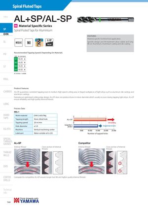 Spiral Fluted Taps Intro AL+SP/AL-SP MS Material Specific Series SP Spiral Fluted Taps for Aluminium DIN FEATURES SL HSS-E NI 2.5PTHCHT Material specific for blind hole application.Specific design and NI treatment allow stable and longlife on Aluminium, Aluminium casting and die-casting. PO Recommended Tapping Speeds Depending On Materials ISO Vc (m/min) N1 10÷25 H N2 10÷25 H ST N3 10÷25 H N4 10÷25 H H 1st choice I suitable ROLL DIN-AL+SP/AL-SP Product Features CARBIDE AL+SP guarantees consistent tapping even in medium-high speed cutting area, in forged workpieces of light alloys such as aluminum die castings and aluminum castings. Featuring an optimized cutting edge design, AL+SP does not produce burrs in minor diameter which usually occours during tapping light alloys. AL+SP ensure reliability and high quality internal threads. LONG Process Data M6×1 HAND Work-material DIN G-AISi7Mg TAPS Tapping length 9mm, blind hole AL+SP Tapping speed 20 m/min Still working Hole diameter ø 5.0 Competitor'sproduct Stopped due to burrs EG (STI) Machine Vertical machining center 5000 10.000 15.000 20.000 25.000 Lubricant Water soluble oil (x 20) Number of tapped holes SPECIAL THREADS,GAUGESAL+SP Competitor Internal thread Cross section of internal Internal thread Cross section of internal threads threads THREAD MILLS DIES CENTER Compared to competitor, AL+SP assures longer tool life and higher quality internal threads DRILLS Technical info 144