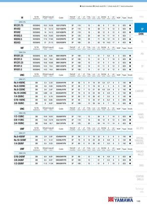 h stock standard, ) check stock EU, f check stock JP, m stock exhaustion M TCTR Ø Hole Ø(tolerance)(mm)(mm)CodeTHCHT(chamfer)LF LT THL LU LS DCON K LK(mm)(mm)(mm)(mm)(mm)(mm)(mm)(mm)NOFTypeStockIntro DIN 376 M12X1.75 ISO2X(6HX) 10.3 10.36 SG012PBIPN 3P 110 - 15 - 56 9 7 10 3 023 h M14X2 ISO2X(6HX) 12 12.12 SG014QBIPN 3P 110 - 18 - 56 11 9 12 3 023 h SP M16X2M18X2.5 ISO2X(6HX) 14 14.12 SG016QBIPN 3P 110 - 18 - 56 12 9 12 4 023 h DINISO2X(6HX)15.515.63SG018RBIPN3P125-20-641411144023f M20X2.5 ISO2X(6HX) 17.5 17.63 SG020RBIPN 3P 140 - 20 - 71 16 12 15 4 023 h M24X3 ISO2X(6HX) 21 21.13 SG024SBIPN 3P 160 - 25 - 82 18 14.5 17 4 023 h SL MF TCTR Ø Hole Ø(tolerance)(mm)(mm)CodeTHCHT(chamfer)LF LT THL LU LS DCON K LK(mm)(mm)(mm)(mm)(mm)(mm)(mm)(mm)NOFTypeStock DIN 374 PO M10X1.25 ISO2X(6HX) 8.8 8.85 SM010NBIPN 3P 100 - 13 - 51 7 5.5 8 3 023 h M12X1.5 ISO2X(6HX) 10.5 10.6 SM012OBIPN 3P 100 - 15 - 51 9 7 10 3 023 h M12X1.25 ISO2X(6HX) 10.8 10.85 SM012NBIPN 3P 100 - 15 - 51 9 7 10 3 023 h M14X1.5 ISO2X(6HX) 12.5 12.6 SM014OBIPN 3P 100 - 14 - 51 11 9 12 3 023 h ST M16X1.5 ISO2X(6HX) 14.5 14.6 SM016OBIPN 3P 100 - 14 - 51 12 9 12 4 023 h UNC TCTR Ø Hole Ø(tolerance)(mm)(mm)CodeTHCHT(chamfer)LF LT THL LU LS DCON K LK(mm)(mm)(mm)(mm)(mm)(mm)(mm)(mm)NOFTypeStock DIN 371 ROLL No.4-40UNC 2BX 2.3 2.33 SDUN4HYIPN 3P 56 5 9 18 34 3.5 2.7 6 3 142 h No.6-32UNC 2BX 2.8 2.83 SDUN6JYIPN 3P 56 7 11 19 32 4 3 6 3 142 h No.8-32UNC 2BX 3.4 3.47 SDUN8JYIPN 3P 63 7 13 21 38 4.5 3.4 6 3 142 h CARBIDE No.10-24UNC 2BX 3.89 3.9 SDUNAMYIPN 3P 70 9 14 24 39 6 4.9 8 3 142 h 1/4-20UNC 2BX 5.1 5.19 SDU04NYIPN 3P 80 11 15 30 42 7 5.5 8 3 142 h 5/16-18UNC 2BX 6.6 6.65 SDU05OYIPN 3P 90 - 12 35 47 8 6.2 9 3 025 h 3/8-16UNC 2BX 8 8.07 SDU06PYIPN 3P 100 - 13 39 54 9 7 10 3 025 h LONG UNC TCTR Ø Hole Ø(tolerance)(mm)(mm)CodeTHCHT(chamfer)LF LT THL LU LS DCON K LK(mm)(mm)(mm)(mm)(mm)(mm)(mm)(mm)NOFTypeStock DIN 376 HAND 1/2-13UNC 2BX 10.9 10.91 SGU08RYIPN 3P 110 - 15 - 56 9 7 10 3 023 h TAPS 5/8-11UNC 2BX 13.6 13.75 SGU10UYIPN 3P 110 - 18 - 56 12 9 12 4 023 h 3/4-10UNC 2BX 16.6 16.7 SGU12VYIPN 3P 125 - 20 - 64 14 11 14 4 023 h UNF TCTR Ø Hole Ø(tolerance)(mm)(mm)CodeTHCHT(chamfer)LF LT THL LU LS DCON K LK(mm)(mm)(mm)(mm)(mm)(mm)(mm)(mm)NOFTypeStockEG (STI) DIN 371 No.6-40UNFNo.10-32UNF 2BX 2.9 2.97 SDUN6HYIPN 3P 56 7 11 19 32 4 3 6 3 142 h SPECIAL2BX4.14.12SDUNAJYIPN3P70914243964.983142hTHREADS, 1/4-28UNF 2BX 5.5 5.53 SDU04KYIPN 3P 80 11 15 30 42 7 5.5 8 3 142 h GAUGES UNF TCTR Ø Hole Ø(tolerance)(mm)(mm)CodeTHCHT(chamfer)LF LT THL LU LS DCON K LK(mm)(mm)(mm)(mm)(mm)(mm)(mm)(mm)NOFTypeStockTHREAD DIN 374 MILLS 5/16-24UNF 2BX 6.9 6.97 SMU05MYIPN 3P 90 - 12 - 46 6 4.9 8 3 023 h 3/8-24UNF 2BX 8.5 8.57 SMU06MYIPN 3P 100 - 13 - 51 7 5.5 8 3 023 h 1/2-20UNF 2BX 11.5 11.54 SMU08NYIPN 3P 100 - 15 - 51 9 7 10 3 023 h DIES CENTER DRILLS Technical info 149
