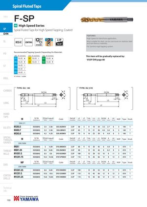 Spiral Fluted Taps Intro F-SP HS High Speed Series SP Spiral Fluted Taps for High Speed Tapping, Coated DIN FEATURES SL HSS-E COATING 2.5PSYNCHROTHCHT High Speed for blind hole application.Most suitable for steel, can be used even on stainless steeland non-ferrous materials. For Synchro-rigid tapping system. PO Recommended Tapping Speeds Depending On Materials ISO Vc (m/min) ISO Vc (m/min) ISO Vc (m/min) This item will be gradually replaced by: P1 15÷25 H M1 10÷20 I N1 15÷30 H . VUSP DIN page 80 P2 15÷25 H M2 10÷20 I N2 15÷30 H ST P3 15÷25 I P4 15÷25 I P7 10÷20 I H 1st choice I suitable ROLL DIN-F-SP TYPE: EU_140 TYPE: EU_019 CARBIDE DCON K DCON K LT LK K LT LK K THL THL LS LONG LU LS LU LF LF HAND TAPS M TCTR Ø Hole Ø(tolerance)(mm)(mm)CodeTHCHT(chamfer)LF LT THL LU LS DCON K LK(mm)(mm)(mm)(mm)(mm)(mm)(mm)(mm)NOFType Stock DIN 371 EG (STI) M3X0.5 ISO2X(6HX) 2.5 2.56 SD3.0GBNEV 2.5P 56 5 9 18 34 3.5 2.7 6 3 140 m M4X0.7 ISO2X(6HX) 3.3 3.38 SD4.0IBNEV 2.5P 63 7 13 21 38 4.5 3.4 6 3 140 m M5X0.8 ISO2X(6HX) 4.2 4.28 SD5.0KBNEV 2.5P 70 9 14 25 39 6 4.9 8 3 140 m SPECIALTHREADS, M TCTR Ø Hole Ø(tolerance)(mm)(mm)CodeTHCHT(chamfer)LF LT THL LU LS DCON K LK(mm)(mm)(mm)(mm)(mm)(mm)(mm)(mm)NOFType Stock GAUGES DIN YMW M6X1 ISO2X(6HX) 5 5.09 SY6.0MBNEV 2.5P 80 11 15 30 45 6 4.9 8 3 019 m THREAD M8X1.25 ISO2X(6HX) 6.8 6.85 SY8.0NBNEV 2.5P 90 - 12 35 48 8 6.2 9 3 019 m MILLS M10X1.5 ISO2X(6HX) 8.5 8.6 SY010OBNEV 2.5P 100 - 13 39 53 10 8 11 3 019 m M12X1.75 ISO2X(6HX) 10.3 10.36 SY012PBNEV 2.5P 110 - 15 45 56 12 9 12 3 019 m DIES MF TCTR Ø Hole Ø(tolerance)(mm)(mm)CodeTHCHT(chamfer)LF LT THL LU LS DCON K LK(mm)(mm)(mm)(mm)(mm)(mm)(mm)(mm)NOFType Stock DIN YMW M10X1.25 ISO2X(6HX) 8.8 8.85 SY010NBNEV 2.5P 100 - 13 39 53 10 8 11 3 019 m M12X1.5 ISO2X(6HX) 10.5 10.6 SY012OBNEV 2.5P 110 - 15 45 56 12 9 12 3 019 m CENTERDRILLSM12X1.25 ISO2X(6HX) 10.8 10.85 SY012NBNEV 2.5P 110 - 15 45 56 12 9 12 3 019 m Technical info 150