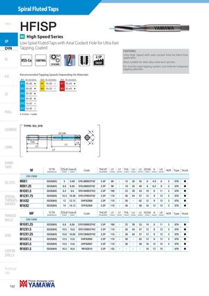 Spiral Fluted Taps Intro HFISP HS High Speed Series SP Low Spiral Fluted Taps with Axial Coolant Hole for Ultra Fast DIN Tapping, Coated FEATURES SL HSS-Co COATING SYNCHRO 2.5P Ultra High Speed with axial coolant hole for blind holeapplicationTHCHTMost suitable for steel, alloy steel and cast iron. For Synchro-rigid tapping system. Low helix for horizontal tapping direction. PO Recommended Tapping Speeds Depending On Materials ISO Vc (m/min) ISO Vc (m/min) ISO Vc (m/min) P1 20÷50 H M1 15÷30 I K1 20÷40 H P2 20÷50 H M2 15÷25 I K2 20÷40 H ST P3 20÷30 H P4 20÷30 H P5 15÷25 I P7 15÷30 I ROLL H 1st choice I suitable DIN-HFISP TYPE: EU_076 CARBIDE K DCON THLLONGLU LS LK K LF HAND TAPS M TCTR Ø Hole Ø(tolerance)(mm)(mm)CodeTHCHT(chamfer)LF LT THL LU LS DCON K LK(mm)(mm)(mm)(mm)(mm)(mm)(mm)(mm)NOFType Stock DIN YMW EG (STI) M6X1 ISO2X(6HX) 5 5.09 SY6.0MBEDTHZ 2.5P 80 - 15 30 45 6 4.9 8 3 076 h M8X1.25 ISO2X(6HX) 6.8 6.85 SY8.0NBEDTHZ 2.5P 90 - 19 35 48 8 6.2 9 3 076 h M10X1.5 ISO2X(6HX) 8.5 8.6 SY010OBEDTHZ 2.5P 100 - 23 39 53 10 8 11 3 076 h SPECIAL M12X1.75 ISO2X(6HX) 10.3 10.36 SY012PBEDTHZ 2.5P 110 - 26 44 57 12 9 12 3 076 h THREADS, M14X2 ISO2X(6HX) 12 12.12 OHFBZ006 2.5P 110 - 26 - 62 12 9 12 3 076 h GAUGES M16X2 ISO2X(6HX) 14 14.12 OFFBZ004 2.5P 110 - 26 - 58 16 12 15 3 076 h THREAD MF TCTR Ø Hole Ø(tolerance)(mm)(mm)CodeTHCHT(chamfer)LF LT THL LU LS DCON K LK(mm)(mm)(mm)(mm)(mm)(mm)(mm)(mm)NOFType Stock MILLS DIN YMW M10X1.25 ISO2X(6HX) 8.8 8.85 SY010NBEDTHZ 2.5P 100 - 23 39 53 10 8 11 3 076 h M12X1.5 ISO2X(6HX) 10.5 10.6 SY012OBEDTHZ 2.5P 110 - 26 44 57 12 9 12 3 076 h DIES M12X1.25 ISO2X(6HX) 10.8 10.85 SY012NBEDTHZ 2.5P 110 - 26 44 57 12 9 12 3 076 h M14X1.5 ISO2X(6HX) 12.5 12.6 OHFBZ005 2.5P 110 - 26 - 62 12 9 12 3 076 h M16X1.5 ISO2X(6HX) 14.5 14.6 OHFBZ007 2.5P 110 - 26 - 58 16 12 15 3 076 h CENTER M18X1.5 ISO2X(6HX) 16.5 16.6 PAFBZ010 2.5P 125 - - - - 16 12 15 076 h DRILLS Technical info 152