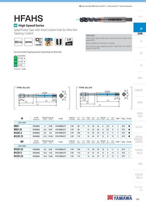 h stock standard, ) check stock EU, f check stock JP, m stock exhaustion HFAHS Intro HS High Speed Series Spiral Fluted Taps with Axial Coolant Hole for Ultra Fast SP Tapping, Coated DIN FEATURES HSS-Co COATING SYNCHRO 2.5P Ultra High Speed with axial coolant hole for blind holeapplication SLTHCHTMost suitable for Aluminium casting. For Synchro-rigid tapping system. High helix for vertical tapping direction. Recommended Tapping Speeds Depending On Materials PO ISO Vc (m/min) N1 30÷100 H N2 30÷100 H N4 30÷60 I ST H 1st choice I suitable ROLL DIN-HFAHS TYPE: EU_073 TYPE: EU_070 DCON K DCON K CARBIDE THL LU LTLKLSKTHLLU LK KLS LONG LF LF HAND TAPS M TCTR Ø Hole Ø(tolerance)(mm)(mm)CodeTHCHT(chamfer)LF LT THL LU LS DCON K LK(mm)(mm)(mm)(mm)(mm)(mm)(mm)(mm)NOFType Stock DIN YMW M6X1 ISO2X(6HX) 5 5.09 SY6.0MBLDTZ 2.5P 80 11 15 30 45 6 4.9 8 3 070 h EG (STI) M8X1.25 ISO2X(6HX) 6.8 6.85 SY8.0NBLDTZ 2.5P 90 - 12 35 48 8 6.2 9 3 073 h M10X1.5 ISO2X(6HX) 8.5 8.6 SY010OBLDTZ 2.5P 100 - 13 39 53 10 8 11 3 073 h M12X1.75 ISO2X(6HX) 10.3 10.36 SY012PBLDTZ 2.5P 110 - 15 44 57 12 9 12 3 073 h SPECIAL THREADS, MF TCTR Ø Hole Ø(tolerance)(mm)(mm)CodeTHCHT(chamfer)LF LT THL LU LS DCON K LK(mm)(mm)(mm)(mm)(mm)(mm)(mm)(mm)NOFType Stock GAUGES DIN YMW M10X1.25 ISO2X(6HX) 8.8 8.85 SY010NBLDTZ 2.5P 100 - 13 39 53 10 8 11 3 073 f THREAD M12X1.5 ISO2X(6HX) 10.5 10.6 SY012OBLDTZ 2.5P 110 - 15 44 57 12 9 12 3 073 f MILLS M12X1.25 ISO2X(6HX) 10.8 10.85 SY012NBLDTZ 2.5P 110 - 15 44 57 12 9 12 3 073 f DIES CENTER DRILLS Technical info 153