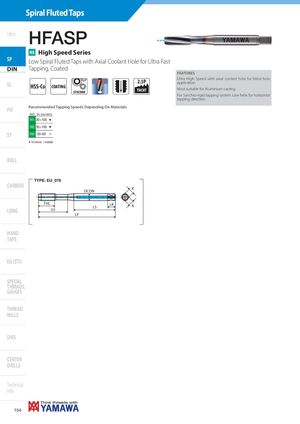Spiral Fluted Taps Intro HFASP HS High Speed Series SP Low Spiral Fluted Taps with Axial Coolant Hole for Ultra Fast DIN Tapping, Coated FEATURES SL HSS-Co COATING SYNCHRO 2.5P Ultra High Speed with axial coolant hole for blind holeapplicationTHCHTMost suitable for Aluminium casting. For Synchro-rigid tapping system. Low helix for horizontal tapping direction. PO Recommended Tapping Speeds Depending On Materials ISO Vc (m/min) N1 30÷100 H N2 30÷100 H ST N4 30÷60 I H 1st choice I suitable ROLL DIN-HFASP TYPE: EU_076 CARBIDE K DCON THLLONGLU LS LK K LF HAND TAPS EG (STI) SPECIAL THREADS, GAUGES THREAD MILLS DIES CENTER DRILLS Technical info 154