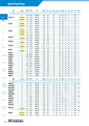 Spiral Fluted Taps Intro M TCTR Ø Hole Ø(tolerance)(mm)(mm)CodeTHCHT(chamfer)LF LT THL LU LS DCON K LK(mm)(mm)(mm)(mm)(mm)(mm)(mm)(mm)NOFTypeStock JIS P2 10.3 10.36 SPQ012P 2.5P 82 - 26 - 42 8.5 6.5 9 3 013 f SP M12X1.75 P3(P2+20) 10.3 10.36 SPR012P 2.5P 82 - 26 - 42 8.5 6.5 9 3 013 f JIS P4(P2+40) 10.3 10.36 SPS012P 2.5P 82 - 26 - 42 8.5 6.5 9 3 013 f P2 12 12.12 SPQ014Q 2.5P 88 - 26 - 45 10.5 8 11 3 013 f M14X2 P3(P2+20) 12 12.12 SPR014Q 2.5P 88 - 26 - 45 10.5 8 11 3 013 f SL P4(P2+40) 12 12.12 SPS014Q 2.5P 88 - 26 - 45 10.5 8 11 3 013 f P2 14 14.12 SPQ016Q 2.5P 95 - 26 - 48 12.5 10 13 3 013 f P3(P2+20) 14 14.12 SPR016Q 2.5P 95 - 26 - 48 12.5 10 13 3 013 f M16X2 PO P4(P2+40) 14 14.12 SPS016Q 2.5P 95 - 26 - 48 12.5 10 13 3 013 f P5(P2+60) 14 14.12 SPT016Q 2.5P 95 - 26 - 48 12.5 10 13 3 013 f P3 15.5 15.63 SPR018R 2.5P 100 - 33 - 51 14 11 14 4 013 f M18X2.5 P4(P3+20) 15.5 15.63 SPS018R 2.5P 100 - 33 - 51 14 11 14 4 013 f ST P3 17.5 17.63 SPR020R 2.5P 105 - 33 - 50 15 12 15 4 013 f M20X2.5 P4(P3+20) 17.5 17.63 SPS020R 2.5P 105 - 33 - 50 15 12 15 4 013 f P3 19.5 19.63 SPR022R 2.5P 115 - 33 - 55 17 13 16 4 013 f M22X2.5 P4(P3+20) 19.5 19.63 SPS022R 2.5P 115 - 33 - 55 17 13 16 4 013 f ROLL P3 21 21.13 SPR024S 2.5P 120 - 39 - 55 19 15 18 4 013 f M24X3 P4(P3+20) 21 21.13 SPS024S 2.5P 120 - 39 - 55 19 15 18 4 013 f M27X3 P3 24 24.13 SPR027S 2.5P 130 - 39 - 60 20 15 18 4 013 f CARBIDE M30X3.5 P4 26.5 26.63 SPS030T 2.5P 135 - 46 - 62 23 17 20 4 013 f M33X3.5 P4 29.5 29.63 SPMS033T 2.5P 145 - 46 - 67 25 19 22 4 013 f M36X4 P4 32 32.12 SPMS036U 2.5P 155 - 52 - 71 28 21 24 4 013 f M39X4 P4 35 35.12 SPMS039U 2.5P 165 - 52 - 76 30 23 26 4 013 f LONG M42X4.5 P4 37.5 37.63 SPMS042V 2.5P 175 - 59 - 81 32 26 30 4 013 f M45X4.5 P4 40.5 40.63 SPMS045V 2.5P 180 - 59 - 83 35 26 30 4 013 f M48X5 P4 43 43.12 SPMS048W 2.5P 185 - 65 - 85 38 29 32 4 013 f HAND M52X5 P4 47 47.1 SPS052W 2.5P 195 - 70 - 86 42 35 35 4 013 f TAPS M56X5.5 P4 50.5 50.6 SPS056X 2.5P 205 - 70 - 91 44 38 38 4 013 f M60X5.5 P4 54.5 54.6 SPS060X 2.5P 215 - 76 - 96 46 38 38 4 013 f M64X6 P4 58 58.1 SPS064Y 2.5P 225 - 79 - 100 48 42 42 4 013 f EG (STI) MF TCTR Ø Hole Ø(tolerance)(mm)(mm)CodeTHCHT(chamfer)LF LT THL LU LS DCON K LK(mm)(mm)(mm)(mm)(mm)(mm)(mm)(mm)NOFTypeStock JIS SPECIAL M2X0.25 P1 1.75 1.77 SPP2.0B 2.5P 42 - 4.5 12 27 3 2.5 5 2 001 ) THREADS,GAUGESM2.3X0.25 P1 2.05 2.07 SPP2.3B 2.5P 42 - 4.5 12 27 3 2.5 5 2 001 f M2.5X0.35 P1 2.2 2.2 SPP2.5D 2.5P 46 - 6.3 14 29 3 2.5 5 2 001 ) M2.6X0.35 P1 2.3 2.3 SPP2.6D 2.5P 46 - 6.3 14 29 3 2.5 5 2 001 f THREAD M3X0.35 P1 2.7 2.7 SPP3.0D 2.5P 46 - 6.5 14 26 4 3.2 6 3 001 ) MILLS M3.5X0.35 P1 3.2 3.2 SPP3.5D 2.5P 52 - 6.5 16 29 5 4 7 3 001 f M4X0.5 P1 3.5 3.56 SPP4.0G 2.5P 52 - 9 17 29 5 4 7 3 001 ) M4.5X0.5 P1 4 4.06 SPP4.5G 2.5P 60 - 9 21 33 5.5 4.5 7 3 001 f DIES M5X0.75 P2 4.3 4.33 SPQ5.0J 2.5P 60 - 13 22 33 5.5 4.5 7 3 001 f M5X0.5 P1 4.5 4.56 SPP5.0G 2.5P 60 - 9 22 33 5.5 4.5 7 3 001 ) M5.5X0.5 P1 5 5.06 SPP5.5G 2.5P 62 - 9 26 33 6 4.5 7 3 001 f CENTERDRILLSM6X0.75 P2 5.3 5.33 SPQ6.0J 2.5P 62 - 15 26 33 6 4.5 7 3 001 )P3(P2+20)5.35.33SPR6.0J2.5P62-15263364.573001f P1 5.5 5.56 SPP6.0G 2.5P 62 - 9 26 33 6 4.5 7 3 001 ) M6X0.5 P2(P1+15) 5.5 5.56 SPQ6.0G 2.5P 62 - 9 26 33 6 4.5 7 3 001 f Technical P3(P1+30) 5.5 5.56 SPR6.0G 2.5P 62 - 9 26 33 6 4.5 7 3 001 f info 158