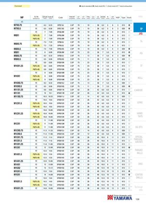 Oversized h stock standard, ) check stock EU, f check stock JP, m stock exhaustion MF TCTR Ø Hole Ø(tolerance)(mm)(mm)CodeTHCHT(chamfer)LF LT THL LU LS DCON K LK(mm)(mm)(mm)(mm)(mm)(mm)(mm)(mm)NOFTypeStockIntro JIS M7X0.75 P2 6.3 6.33 SPQ7.0J 2.5P 70 - 19 - 36 6.2 5 8 3 013 ) M7X0.5 P2 6.5 6.56 SPQ7.0G 2.5P 70 - 10 - 36 6.2 5 8 3 020 ) SP M8X1 P2 7 7.09 SPQ8.0M 2.5P 70 - 19 - 36 6.2 5 8 3 013 f JISP3(P2+20)77.09SPR8.0M2.5P70-19-366.2583013f P4(P2+40) 7 7.09 SPS8.0M 2.5P 70 - 19 - 36 6.2 5 8 3 013 f P2 7.3 7.33 SPQ8.0J 2.5P 70 - 19 - 36 6.2 5 8 3 013 f SL M8X0.75 P3(P2+20) 7.3 7.33 SPR8.0J 2.5P 70 - 19 - 36 6.2 5 8 3 013 f M8X0.5 P2 7.5 7.56 SPQ8.0G 2.5P 70 - 10 - 36 6.2 5 8 3 020 ) M9X1 P2 8 8.09 SPQ9.0M 2.5P 75 - 23 - 38 7 5.5 8 3 013 ) PO M9X0.75 P2 8.3 8.33 SPQ9.0J 2.5P 75 - 13 - 38 7 5.5 8 3 020 ) M9X0.5 P2 8.5 8.56 SPQ9.0G 2.5P 75 - 11 - 38 7 5.5 8 3 020 f P2 8.8 8.85 SPQ010N 2.5P 75 - 23 - 38 7 5.5 8 3 013 f M10X1.25 P3(P2+20) 8.8 8.85 SPR010N 2.5P 75 - 23 - 38 7 5.5 8 3 013 f ST P4(P2+40) 8.8 8.85 SPS010N 2.5P 75 - 23 - 38 7 5.5 8 3 013 f P2 9 9.09 SPQ010M 2.5P 75 - 23 - 38 7 5.5 8 3 013 f M10X1 P3(P2+20) 9 9.09 SPR010M 2.5P 75 - 23 - 38 7 5.5 8 3 013 fP4(P2+40)99.09SPS010M2.5P75-23-3875.583013fROLL M10X0.75 P2 9.3 9.33 SPQ010J 2.5P 75 - 13 - 38 7 5.5 8 3 020 f M10X0.5 P2 9.5 9.56 SPQ010G 2.5P 75 - 11 - 38 7 5.5 8 3 020 ) M11X1.25 P2 9.8 9.85 SPQ011N 2.5P 82 - 26 - 42 8.5 6.5 9 3 013 f CARBIDE M11X1 P2 10 10.1 SPQ011M 2.5P 82 - 26 - 42 8.5 6.5 9 3 013 ) M11X0.75 P2 10.3 10.33 SPQ011J 2.5P 82 - 14 - 42 8.5 6.5 9 3 020 f P2 10.5 10.6 SPQ012O 2.5P 82 - 26 - 42 8.5 6.5 9 3 013 f M12X1.5 P3(P2+20) 10.5 10.6 SPR012O 2.5P 82 - 26 - 42 8.5 6.5 9 3 013 f LONG P4(P2+40) 10.5 10.6 SPS012O 2.5P 82 - 26 - 42 8.5 6.5 9 3 013 f P2 10.8 10.85 SPQ012N 2.5P 82 - 26 - 42 8.5 6.5 9 3 013 f M12X1.25 P3(P2+20) 10.8 10.85 SPR012N 2.5P 82 - 26 - 42 8.5 6.5 9 3 013 f HAND P4(P2+40) 10.8 10.85 SPS012N 2.5P 82 - 26 - 42 8.5 6.5 9 3 013 f TAPS P2 11 11.09 SPQ012M 2.5P 82 - 26 - 42 8.5 6.5 9 3 013 f M12X1 P3(P2+20) 11 11.09 SPR012M 2.5P 82 - 26 - 42 8.5 6.5 9 3 013 f P4(P2+40) 11 11.09 SPS012M 2.5P 82 - 26 - 42 8.5 6.5 9 3 013 f EG (STI) M12X0.75 P2 11.3 11.33 SPQ012J 2.5P 82 - 14 - 42 8.5 6.5 9 3 020 f M12X0.5 P2 11.5 11.56 SPQ012G 2.5P 82 - 12 - 42 8.5 6.5 9 3 020 f M13X1.75 P2 11.3 11.4 SPQ013P 2.5P 88 - 26 - 45 10.5 8 11 3 013 f SPECIAL M13X1.5 P2 11.5 11.6 SPQ013O 2.5P 88 - 26 - 45 10.5 8 11 3 013 f THREADS,GAUGES M13X1.25 P2 11.8 11.85 SPQ013N 2.5P 88 - 26 - 45 10.5 8 11 3 013 f M13X1 P2 12 12.09 SPQ013M 2.5P 88 - 26 - 45 10.5 8 11 3 013 ) P2 12.5 12.6 SPQ014O 2.5P 88 - 26 - 45 10.5 8 11 3 013 f THREAD M14X1.5 P3(P2+20) 12.5 12.6 SPR014O 2.5P 88 - 26 - 45 10.5 8 11 3 013 f MILLS P4(P2+40) 12.5 12.6 SPS014O 2.5P 88 - 26 - 45 10.5 8 11 3 013 f M14X1.25 P2 12.8 12.85 SPQ014N 2.5P 88 - 26 - 45 10.5 8 11 3 013 f M14X1 P2 13 13.09 SPQ014M 2.5P 88 - 26 - 45 10.5 8 11 3 013 f DIES M15X2 P2 13 13.12 SPQ015Q 2.5P 95 - 26 - 48 12.5 10 13 3 013 f M15X1.5 P2 13.5 13.6 SPQ015O 2.5P 95 - 26 - 48 12.5 10 13 3 013 ) M15X1 P2 14 14.09 SPQ015M 2.5P 95 - 26 - 48 12.5 10 13 3 013 ) CENTER P2 14.5 14.6 SPQ016O 2.5P 95 - 26 - 48 12.5 10 13 3 013 f DRILLS M16X1.5 P3(P2+20) 14.5 14.6 SPR016O 2.5P 95 - 26 - 48 12.5 10 13 3 013 f P4(P2+40) 14.5 14.6 SPS016O 2.5P 95 - 26 - 48 12.5 10 13 3 013 f M16X1.25 P2 14.8 14.85 SPQ016N 2.5P 95 - 26 - 48 12.5 10 13 3 013 f Technicalinfo 159