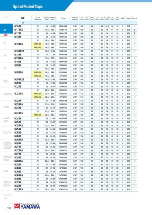 Spiral Fluted Taps Intro MF TCTR Ø Hole Ø(tolerance)(mm)(mm)CodeTHCHT(chamfer)LF LT THL LU LS DCON K LK(mm)(mm)(mm)(mm)(mm)(mm)(mm)(mm)NOFTypeStock JIS M16X1 P2 15 15.09 SPQ016M 2.5P 95 - 26 - 48 12.5 10 13 3 013 f SP M17X1.5 P2 15.5 15.6 SPQ017O 2.5P 100 - 33 - 51 14 11 14 4 013 ) JIS M17X1M18X2 P2 16 16.09 SPQ017M 2.5P 100 - 18 - 51 14 11 14 4 020 )P31616.12SPR018Q2.5P100-33-511411144013f P2 16.5 16.6 SPQ018O 2.5P 100 - 33 - 51 14 11 14 4 013 f SL M18X1.5 P3(P2+20) 16.5 16.6 SPR018O 2.5P 100 - 33 - 51 14 11 14 4 013 f P4(P2+40) 16.5 16.6 SPS018O 2.5P 100 - 33 - 51 14 11 14 4 013 f M18X1.25 P2 16.8 16.85 SPQ018N 2.5P 100 - 33 - 51 14 11 14 4 013 f PO M18X1 P2 17 17.09 SPQ018M 2.5P 100 - 18 - 51 14 11 14 4 020 f M19X1.5 P3 17.5 17.6 SPR019O 2.5P 105 - 33 - 50 15 12 15 4 013 f M19X1 P2 18 18.09 SPQ019M 2.5P 105 - 18 - 50 15 12 15 4 020 ) M20X2 P3 18 18.12 SPR020Q 2.5P 105 - 33 - 50 15 12 15 4 013 f ST P3 18.5 18.6 SPR020O 2.5P 105 - 33 - 50 15 12 15 4 013 f M20X1.5 P4(P3+20) 18.5 18.6 SPS020O 2.5P 105 - 33 - 50 15 12 15 4 013 f P5(P3+40) 18.5 18.6 SPT020O 2.5P 105 - 33 - 50 15 12 15 4 013 f ROLL M20X1.25M20X1 P2 18.8 18.85 SPQ020N 2.5P 105 - 18 - 50 15 12 15 4 020 fP21919.09SPQ020M2.5P105-18-501512154020f M22X2 P3 20 20.12 SPR022Q 2.5P 115 - 33 - 55 17 13 16 4 013 f P3 20.5 20.6 SPR022O 2.5P 115 - 33 - 55 17 13 16 4 013 f CARBIDE M22X1.5 P4(P3+20) 20.5 20.6 SPS022O 2.5P 115 - 33 - 55 17 13 16 4 013 f P5(P3+40) 20.5 20.6 SPT022O 2.5P 115 - 33 - 55 17 13 16 4 013 f M22X1 P2 21 21.09 SPQ022M 2.5P 115 - 19 - 55 17 13 16 4 020 f M23X1.5 P3 21.5 21.6 SPR023O 2.5P 120 - 39 - 55 19 15 18 4 013 f LONG M24X2 P3 22 22.12 SPR024Q 2.5P 120 - 39 - 55 19 15 18 4 013 f P3 22.5 22.6 SPR024O 2.5P 120 - 39 - 55 19 15 18 4 013 f M24X1.5 P4(P3+20) 22.5 22.6 SPS024O 2.5P 120 - 39 - 55 19 15 18 4 013 f HAND M24X1 P2 23 23.09 SPQ024M 2.5P 120 - 19 - 55 19 15 18 4 020 f TAPS M25X2 P3 23 23.12 SPR025Q 2.5P 125 - 39 - 58 19 15 18 4 013 f M25X1.5 P3 23.5 23.6 SPR025O 2.5P 125 - 39 - 58 19 15 18 4 013 f M25X1 P2 24 24.09 SPQ025M 2.5P 125 - 20 - 58 19 15 18 4 020 f EG (STI) M26X3 P3 23 23.12 SPR026S 2.5P 130 - 39 - 60 20 15 18 4 013 f M26X2 P3 24 24.12 SPR026Q 2.5P 130 - 39 - 60 20 15 18 4 013 f M26X1.5 P3 24.5 24.6 SPR026O 2.5P 130 - 39 - 60 20 15 18 4 013 f SPECIAL M26X1 P2 25 25.09 SPQ026M 2.5P 130 - 20 - 60 20 15 18 4 020 f THREADS,GAUGESM27X2 P3 25 25.12 SPR027Q 2.5P 130 - 39 - 60 20 15 18 4 013 f M27X1.5 P3 25.5 25.6 SPR027O 2.5P 130 - 39 - 60 20 15 18 4 013 f M27X1 P2 26 26.09 SPQ027M 2.5P 130 - 20 - 60 20 15 18 4 020 f THREAD M28X2 P3 26 26.12 SPR028Q 2.5P 135 - 46 - 62 23 17 20 4 013 f MILLS M28X1.5 P3 26.5 26.6 SPR028O 2.5P 135 - 46 - 62 23 17 20 4 013 f M28X1 P2 27 27.09 SPQ028M 2.5P 135 - 20 - 62 23 17 20 4 020 f M30X3 P3 27 27.13 SPR030S 2.5P 135 - 46 - 62 23 17 20 4 013 f DIES M30X2 P3 28 28.12 SPR030Q 2.5P 135 - 46 - 62 23 17 20 4 013 f M30X1.5 P3 28.5 28.6 SPR030O 2.5P 135 - 46 - 62 23 17 20 4 013 f M30X1 P2 29 29.09 SPQ030M 2.5P 135 - 21 - 62 23 17 20 4 020 f CENTER M32X3 P3 29 29.13 SPMR032S 2.5P 145 - 46 - 67 24 19 22 4 013 f DRILLS M32X2 P3 30 30.12 SPMR032Q 2.5P 145 - 46 - 67 24 19 22 4 013 f M32X1.5 P3 30.5 30.6 SPMR032O 2.5P 145 - 46 - 67 24 19 22 4 013 f Technical info 160
