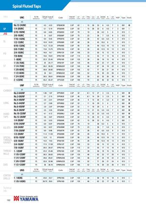 Spiral Fluted Taps Intro UNC TCTR Ø Hole Ø(tolerance)(mm)(mm)CodeTHCHT(chamfer)LF LT THL LU LS DCON K LK(mm)(mm)(mm)(mm)(mm)(mm)(mm)(mm)NOFTypeStock JIS No.12-24UNC P2 4.5 4.53 SPQUNCM 2.5P 62 - 15 26 33 6 4.5 7 3 001 ) SP 1/4-20UNC P2 5.1 5.19 SPQU04N 2.5P 62 - 15 26 33 6 4.5 7 3 001 f JIS 5/16-18UNC3/8-16UNC P2 6.6 6.65 SPQU05O 2.5P 70 - 19 - 36 6.2 5 8 3 013 fP288.07SPQU06P2.5P75-23-3875.583013f 7/16-14UNC P3 9.4 9.45 SPRU07Q 2.5P 82 - 26 - 42 8.5 6.5 9 3 013 f SL 1/2-13UNC P3 10.9 10.91 SPRU08R 2.5P 88 - 26 - 45 10.5 8 11 3 013 f 9/16-12UNC P3 12.2 12.33 SPRU09S 2.5P 95 - 26 - 48 12.5 10 13 3 013 f 5/8-11UNC P3 13.6 13.75 SPRU10U 2.5P 95 - 26 - 48 12.5 10 13 3 013 f PO 3/4-10UNC P3 16.6 16.7 SPRU12V 2.5P 105 - 33 - 50 15 12 15 4 013 f 7/8-9UNC P3 19.6 19.61 SPRU14W 2.5P 115 - 33 - 55 17 13 16 4 013 f 1 -8UNC P3 22.3 22.45 SPRU16X 2.5P 125 - 39 - 58 19 15 18 4 013 f 1 1/8-7UNC P4 25 25.17 SPSU18Y 2.5P 135 - 46 - 62 23 17 20 4 013 f ST 1 1/4-7UNC P4 28.2 28.35 SPMSU20Y 2.5P 145 - 46 - 67 24 19 22 4 013 f 1 3/8-6UNC P4 30.8 30.92 SPMSU22Z 2.5P 155 - 52 - 71 28 21 24 4 013 f 1 1/2-6UNC P4 34 34.1 SPMSU24Z 2.5P 165 - 52 - 76 30 23 26 4 013 f ROLL 1 3/4-5UNC2 -4.5UNC P4 39.5 39.61 SPMSU280 2.5P 180 - 59 - 83 35 26 30 4 013 fP545.245.37SPTU3292.5P195-70-854032354013f UNF TCTR Ø Hole Ø(tolerance)(mm)(mm)CodeTHCHT(chamfer)LF LT THL LU LS DCON K LK(mm)(mm)(mm)(mm)(mm)(mm)(mm)(mm)NOFTypeStock CARBIDE JIS No.2-64UNF P1 1.85 1.87 SPPUN2D 2.5P 42 - 8.1 12 27 3 2.5 5 2 001 ) No.3-56UNF P1 2.1 2.15 SPPUN3E 2.5P 46 - 8.1 14 29 3 2.5 5 2 001 ) No.4-48UNF P1 2.4 2.41 SPPUN4F 2.5P 46 - 9 14 26 4 3.2 6 2 001 ) LONG No.5-44UNF P1 2.7 2.69 SPPUN5G 2.5P 52 - 11 16 29 5 4 7 3 001 ) No.6-40UNF P1 2.9 2.97 SPPUN6H 2.5P 52 - 11 16 29 5 4 7 3 001 ) No.8-36UNF P2 3.5 3.55 SPQUN8I 2.5P 60 - 13 21 33 5.5 4.5 7 3 001 ) HAND No.10-32UNF P2 4.1 4.12 SPQUNAJ 2.5P 60 - 13 22 33 5.5 4.5 7 3 001 ) TAPS No.12-28UNF P2 4.6 4.67 SPQUNCK 2.5P 62 - 15 26 33 6 4.5 7 3 001 ) 1/4-28UNF P2 5.5 5.53 SPQU04K 2.5P 62 - 15 26 33 6 4.5 7 3 001 f 5/16-24UNF P2 6.9 6.97 SPQU05M 2.5P 70 - 19 - 36 6.2 5 8 3 013 f EG (STI) 3/8-24UNF P2 8.5 8.57 SPQU06M 2.5P 75 - 23 - 38 7 5.5 8 3 013 f 7/16-20UNF P2 9.9 9.96 SPQU07N 2.5P 82 - 26 - 42 8.5 6.5 9 3 013 f 1/2-20UNF P2 11.5 11.54 SPQU08N 2.5P 88 - 26 - 45 10.5 8 11 3 013 f SPECIAL 9/16-18UNF P2 12.9 13 SPQU09O 2.5P 95 - 26 - 48 12.5 10 13 3 013 f THREADS,GAUGES5/8-18UNF P2 14.5 14.6 SPQU10O 2.5P 95 - 26 - 48 12.5 10 13 3 013 f 3/4-16UNF P3 17.5 17.59 SPRU12P 2.5P 105 - 33 - 50 15 12 15 4 013 f 7/8-14UNF P3 20.5 20.57 SPRU14Q 2.5P 115 - 33 - 55 17 13 16 4 013 f THREAD 1 -12UNF P3 23.3 23.46 SPRU16S 2.5P 125 - 39 - 58 19 15 18 4 013 f MILLS 1 1/8-12UNF P3 26.5 26.63 SPRU18S 2.5P 135 - 46 - 62 23 17 20 4 013 f 1 1/4-12UNF P3 29.6 29.81 SPMRU20S 2.5P 145 - 46 - 67 24 19 22 4 013 f 1 3/8-12UNF P3 32.8 32.98 SPMRU22S 2.5P 155 - 52 - 71 28 21 24 4 013 f DIES 1 1/2-12UNF P3 36 36.16 SPMRU24S 2.5P 165 - 52 - 76 30 23 26 4 013 f UNS TCTR Ø Hole Ø(tolerance)(mm)(mm)CodeTHCHT(chamfer)LF LT THL LU LS DCON K LK(mm)(mm)(mm)(mm)(mm)(mm)(mm)(mm)NOFTypeStock CENTER JIS DRILLS 1 -14UNS P3 23.6 23.7 SPRU16Q 2.5P 125 - 39 - 58 19 15 18 4 013 f 1 1/8-14UNS P3 26.75 26.8 SPRU18Q 2.5P 135 - 46 - 62 23 17 20 4 013 f Technical info 162