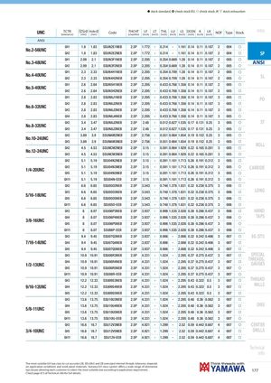 h stock standard, ) check stock EU, f check stock JP, m stock exhaustion UNC TCTR Ø Hole Ø(tolerance)(mm)(mm)CodeTHCHT(chamfer)LF LT THL LU LS DCON K LK(inch)(inch)(inch)(inch)(inch)(inch)(inch)(inch)NOFTypeStockIntro ANSI GH1 1.8 1.83 SSUN2E1NEB 2.5P 1.772 - 0.314 - 1.161 0.14 0.11 0.187 2 004 f No.2-56UNC GH2 1.8 1.83 SSUN2E2NEB 2.5P 1.772 - 0.314 - 1.161 0.14 0.11 0.187 2 004 f SP No.3-48UNC GH1 2.09 2.1 SSUN3F1NEB 2.5P 2.205 - 0.354 0.669 1.28 0.14 0.11 0.187 2 005 f ANSI GH2 2.09 2.1 SSUN3F2NEB 2.5P 2.205 - 0.354 0.669 1.28 0.14 0.11 0.187 2 005 f GH1 2.3 2.33 SSUN4H1NEB 2.5P 2.205 - 0.354 0.709 1.28 0.14 0.11 0.187 2 005 f No.4-40UNC GH2 2.3 2.33 SSUN4H2NEB 2.5P 2.205 - 0.354 0.709 1.28 0.14 0.11 0.187 2 005 f SL GH1 2.6 2.64 SSUN5H1NEB 2.5P 2.205 - 0.433 0.768 1.358 0.14 0.11 0.187 2 005 f No.5-40UNC GH2 2.6 2.64 SSUN5H2NEB 2.5P 2.205 - 0.433 0.768 1.358 0.14 0.11 0.187 2 005 f GH1 2.8 2.83 SSUN6J1NEB 2.5P 2.205 - 0.433 0.768 1.358 0.14 0.11 0.187 3 005 f PO GH2 2.8 2.83 SSUN6J2NEB 2.5P 2.205 - 0.433 0.768 1.358 0.14 0.11 0.187 3 005 f No.6-32UNC GH3 2.8 2.83 SSUN6J3NEB 2.5P 2.205 - 0.433 0.768 1.358 0.14 0.11 0.187 3 005 f GH4 2.8 2.83 SSUN6J4NEB 2.5P 2.205 - 0.433 0.768 1.358 0.14 0.11 0.187 3 005 f GH2 3.4 3.47 SSUN8J2NEB 2.5P 2.48 - 0.512 0.827 1.535 0.17 0.131 0.25 3 005 f ST No.8-32UNC GH3 3.4 3.47 SSUN8J3NEB 2.5P 2.48 - 0.512 0.827 1.535 0.17 0.131 0.25 3 005 f GH2 3.89 3.9 SSUNAM2NEB 2.5P 2.756 - 0.551 0.984 1.654 0.19 0.152 0.25 3 005 f No.10-24UNC GH3 3.89 3.9 SSUNAM3NEB 2.5P 2.756 - 0.551 0.984 1.654 0.19 0.152 0.25 3 005 f GH2 4.5 4.53 SSUNCM2NEB 2.5P 3.15 - 0.591 0.984 1.929 0.22 0.165 0.281 3 005 f ROLL No.12-24UNC GH3 4.5 4.53 SSUNCM3NEB 2.5P 3.15 - 0.591 0.984 1.929 0.22 0.165 0.281 3 005 f GH2 5.1 5.19 SSU04N2NEB 2.5P 3.15 - 0.591 1.181 1.713 0.26 0.191 0.312 3 005 f 1/4-20UNC GH3 5.1 5.19 SSU04N3NEB 2.5P 3.15 - 0.591 1.181 1.713 0.26 0.191 0.312 3 005 f CARBIDE GH5 5.1 5.19 SSU04N5NEB 2.5P 3.15 - 0.591 1.181 1.713 0.26 0.191 0.312 3 005 f GH11 5.1 5.19 SSU04N-EEB 2.5P 3.15 - 0.591 1.181 1.713 0.26 0.191 0.312 3 005 f GH2 6.6 6.65 SSU05O2NEB 2.5P 3.543 - 0.748 1.378 1.831 0.32 0.238 0.375 3 006 f GH3 6.6 6.65 SSU05O3NEB 2.5P 3.543 - 0.748 1.378 1.831 0.32 0.238 0.375 3 006 f LONG 5/16-18UNC GH5 6.6 6.65 SSU05O5NEB 2.5P 3.543 - 0.748 1.378 1.831 0.32 0.238 0.375 3 006 f GH11 6.6 6.65 SSU05O-EEB 2.5P 3.543 - 0.748 1.378 1.831 0.32 0.238 0.375 3 006 f GH3 8 8.07 SSU06P3NEB 2.5P 3.937 - 0.906 1.535 2.028 0.38 0.286 0.437 3 006 f HAND GH4 8 8.07 SSU06P4NEB 2.5P 3.937 - 0.906 1.535 2.028 0.38 0.286 0.437 3 006 f TAPS 3/8-16UNC GH5 8 8.07 SSU06P5NEB 2.5P 3.937 - 0.906 1.535 2.028 0.38 0.286 0.437 3 006 f GH11 8 8.07 SSU06P-EEB 2.5P 3.937 - 0.906 1.535 2.028 0.38 0.286 0.437 3 006 f GH3 9.4 9.45 SSU07Q3NEB 2.5P 3.937 - 0.906 - 2.008 0.32 0.242 0.406 3 007 f EG (STI) 7/16-14UNC GH4 9.4 9.45 SSU07Q4NEB 2.5P 3.937 - 0.906 - 2.008 0.32 0.242 0.406 3 007 f GH5 9.4 9.45 SSU07Q5NEB 2.5P 3.937 - 0.906 - 2.008 0.32 0.242 0.406 3 007 f GH3 10.9 10.91 SSU08R3NEB 2.5P 4.331 - 1.024 - 2.205 0.37 0.275 0.437 3 007 f SPECIAL 1/2-13UNC GH4 10.9 10.91 SSU08R4NEB 2.5P 4.331 - 1.024 - 2.205 0.37 0.275 0.437 3 007 f THREADS,GAUGES GH5 10.9 10.91 SSU08R5NEB 2.5P 4.331 - 1.024 - 2.205 0.37 0.275 0.437 3 007 f GH11 10.9 10.91 SSU08R-EEB 2.5P 4.331 - 1.024 - 2.205 0.37 0.275 0.437 3 007 f GH3 12.2 12.33 SSU09S3NEB 2.5P 4.331 - 1.024 - 2.205 0.43 0.322 0.5 3 007 f THREAD 9/16-12UNC GH4 12.2 12.33 SSU09S4NEB 2.5P 4.331 - 1.024 - 2.205 0.43 0.322 0.5 3 007 f MILLS GH5 12.2 12.33 SSU09S5NEB 2.5P 4.331 - 1.024 - 2.205 0.43 0.322 0.5 3 007 f GH3 13.6 13.75 SSU10U3NEB 2.5P 4.331 - 1.024 - 2.205 0.48 0.36 0.562 3 007 f GH4 13.6 13.75 SSU10U4NEB 2.5P 4.331 - 1.024 - 2.205 0.48 0.36 0.562 3 007 f DIES 5/8-11UNC GH5 13.6 13.75 SSU10U5NEB 2.5P 4.331 - 1.024 - 2.205 0.48 0.36 0.562 3 007 f GH11 13.6 13.75 SSU10U-EEB 2.5P 4.331 - 1.024 - 2.205 0.48 0.36 0.562 3 007 f GH3 16.6 16.7 SSU12V3NEB 2.5P 4.921 - 1.299 - 2.52 0.59 0.442 0.687 4 007 f CENTER 3/4-10UNC GH5 16.6 16.7 SSU12V5NEB 2.5P 4.921 - 1.299 - 2.52 0.59 0.442 0.687 4 007 f DRILLS GH11 16.6 16.7 SSU12V-EEB 2.5P 4.921 - 1.299 - 2.52 0.59 0.442 0.687 4 007 f Technical info The most suitable GH tap class to cut accurate 2B, 3B (UNJ) and 2B oversized internal threads tolerance, depends on application conditions and work-piece materials. Yamawa GH class system offers a wide range of alternative tap classes allowing each customer to select the most suitable one according to application requirement. 177 Check page 673 of Technical info for full details.